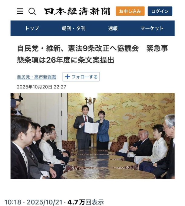 高市自民と維新が早速ながら、日中戦争のための改憲・緊急事態条項を推進。
