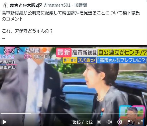 あら、朝鮮カルト系右翼の高市さん、靖国行かないの?