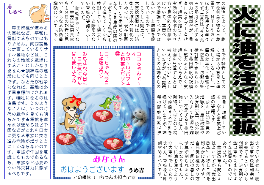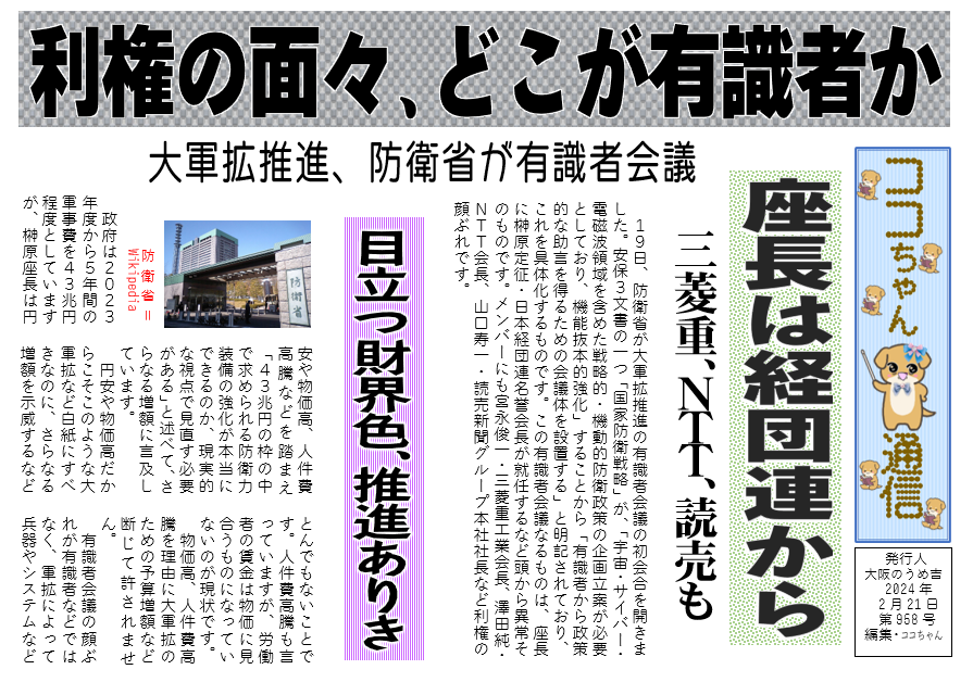 | … | 6無題Name名無し 25/11/28(金)13:17:50 IP:58.158.*(ucom.ne.jp)No.2679595+ 1764303470650.png-(309440 B) 19日、防衛省が大軍拡推進の有識者会議の初会合を開きました。安保3文書の一つ「国家防衛戦略」が、「宇宙・サイバー・電磁波領域を含めた戦略的・機動的防衛政策の企画立案が必要としており、機能抜本的強化」することから「有識者から政策的な助言を得るための会議体を設置する」と明記されており、これを具体化するものです。この有識者会議なるものは、座長に榊原定征・日本経団連名誉会長が就任するなど頭から異常そのものです。メンバーにも宮永俊一・三菱重工業会長、澤田純・NTT会長、山口寿一・読売新聞グループ本社社長など利権の顔ぶれです。 |