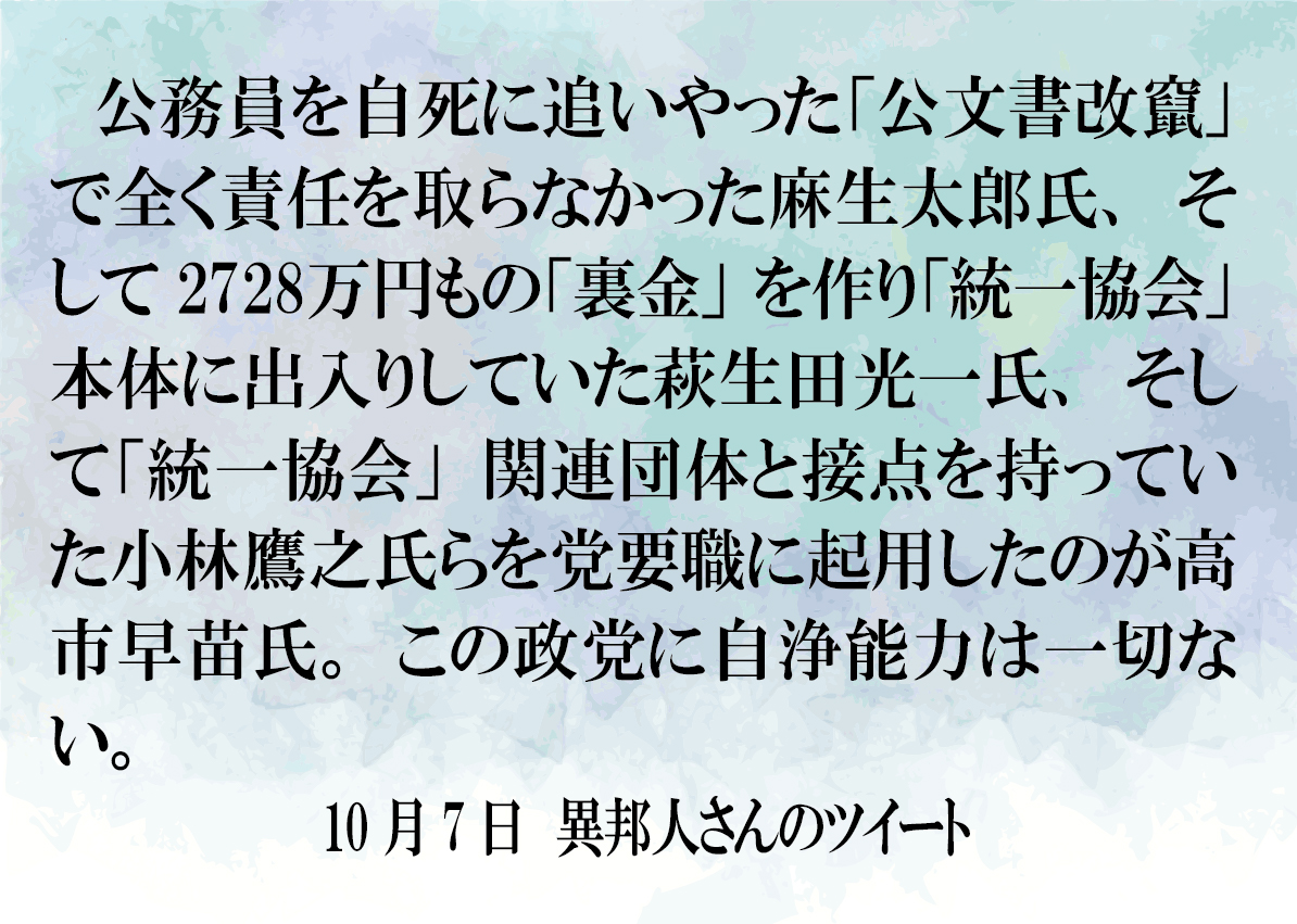 というわけで、統一教会食口の高市さんが、ついに、総理の座を強奪しましたので、今後は、