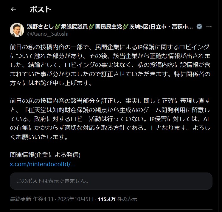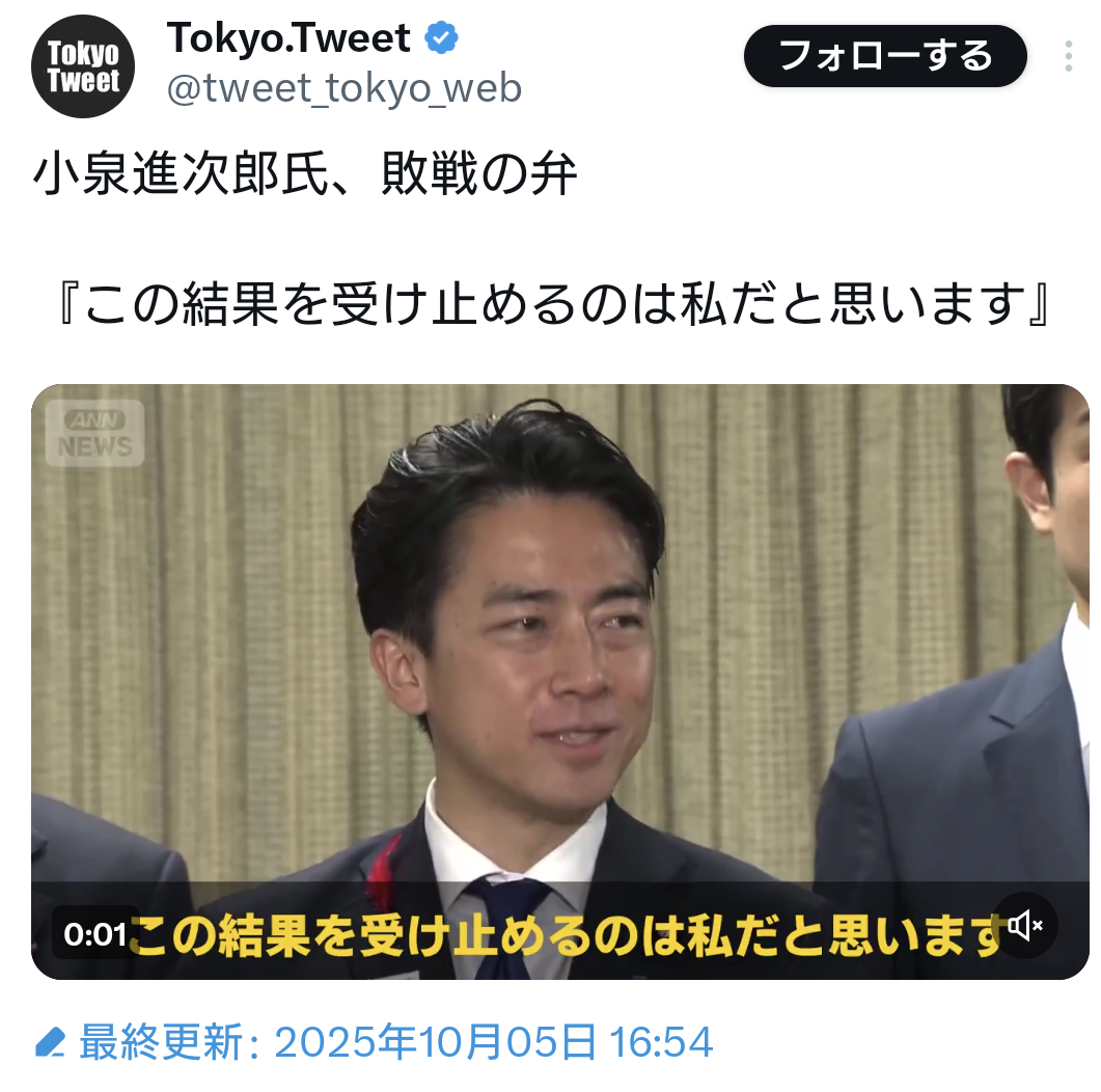 … | 56無題Name名無し 25/10/05(日)22:31:24 IP:14.3.*(asahi-net.or.jp)No.2665365そうだねx13結果を真摯に受け止めこれからも一議員として国民のために・・・ |
