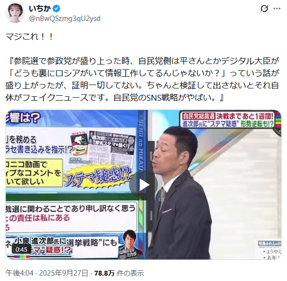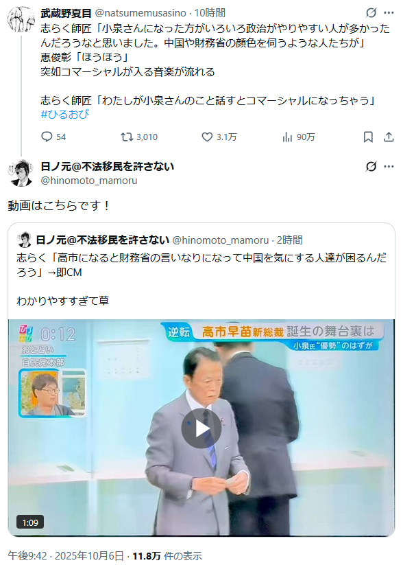 … | 36無題Name名無し 25/10/05(日)21:27:36 IP:106.131.*(au-net.ne.jp)No.2665342そうだねx18マスコミは前回の参院選の時もそうだったけど |
