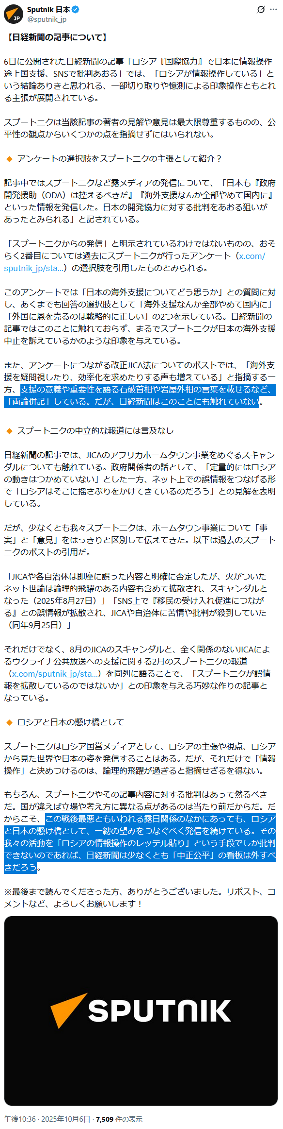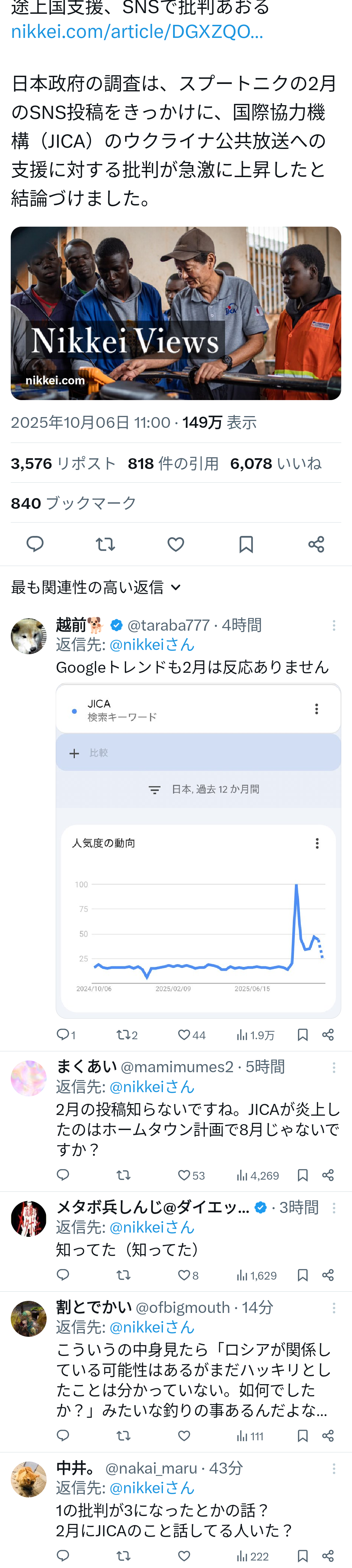 … | 285無題Name名無し 25/10/06(月)23:55:54 IP:153.232.*(dti.ne.jp)No.2665692そうだねx15JICAは明らかに地域住民とかの意思と関係なく移民受け入れプロジェクトを地方自治体と動かしてた訳でしてしかもそれを否定・訂正もせずに表向きだけ取り下げたっていうのは明らかに国民の批判は避けられない案件と理解してましたよね |
