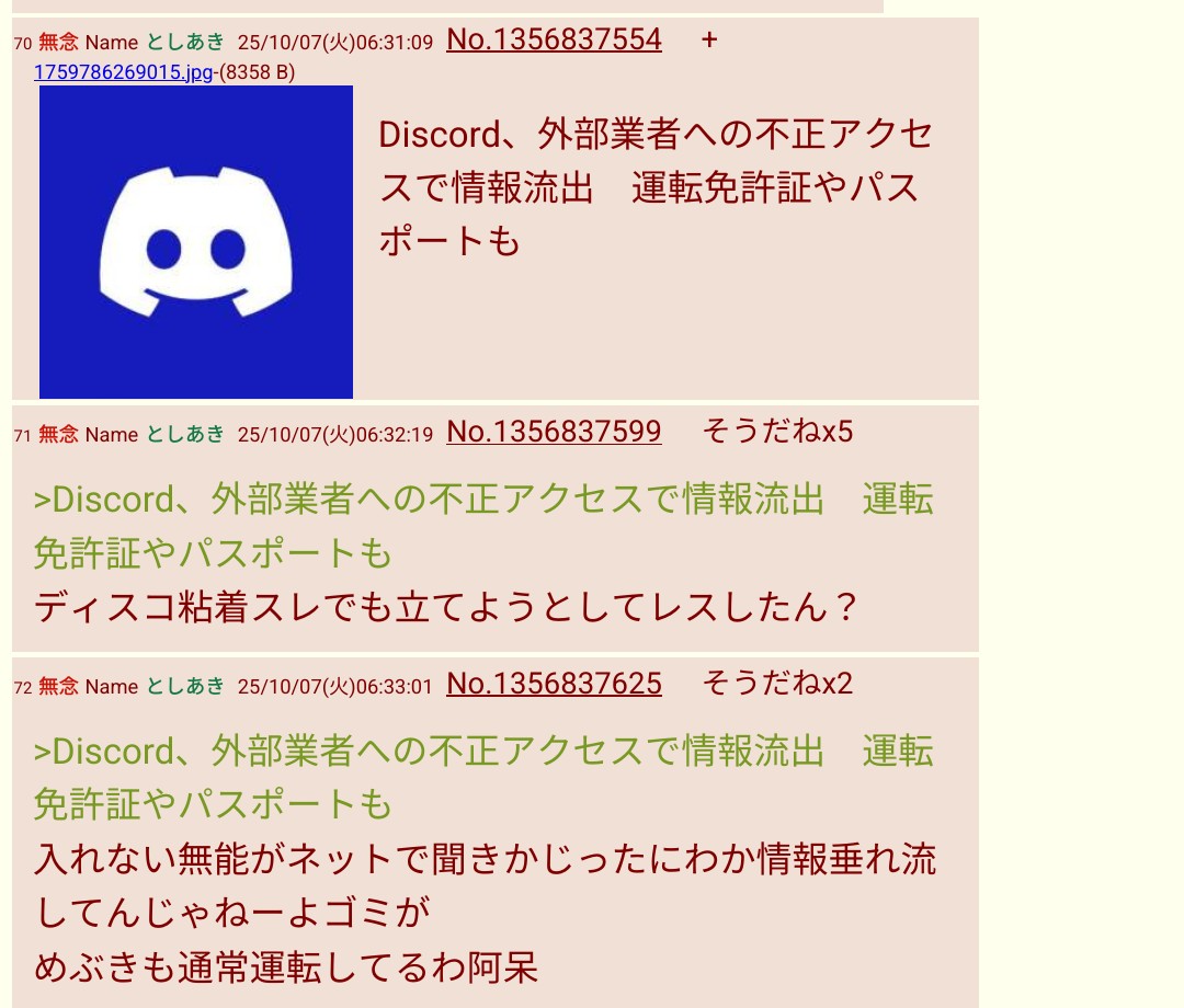 … | 328無題Name名無し 25/10/07(火)09:55:18 IP:61.25.*(home.ne.jp)No.2665776そうだねx9>Discordのサポートページを利用したユーザーの個人情報が第三者による不正アクセスで流出。 |