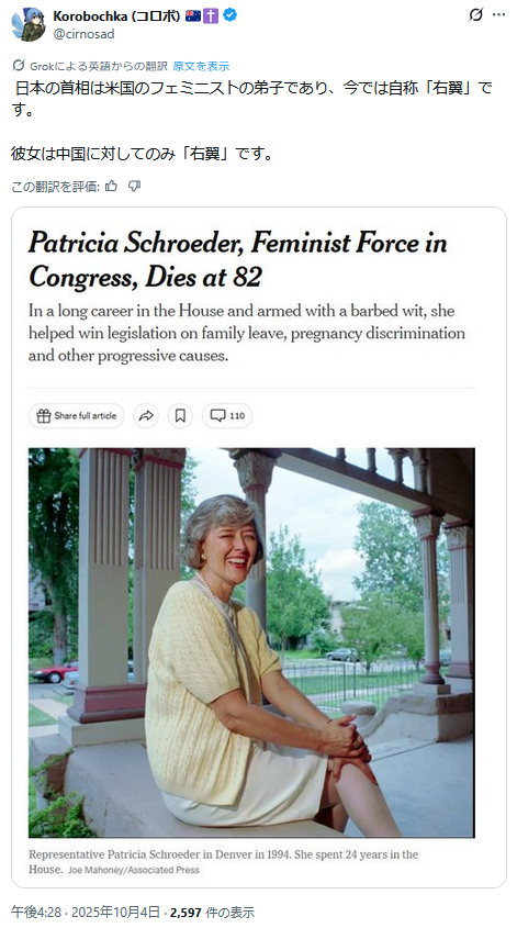 … | 64無題Name名無し 25/10/06(月)00:34:03 IP:117.55.*(ipv4)No.2665373そうだねx18>フェミは初の女性総理で拍手喝采しなきゃおかしいのになんでけおってるんでしょうね |
