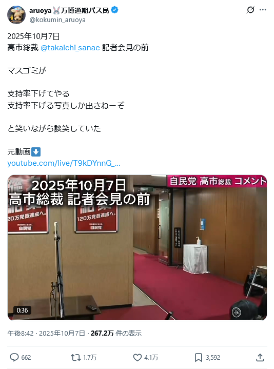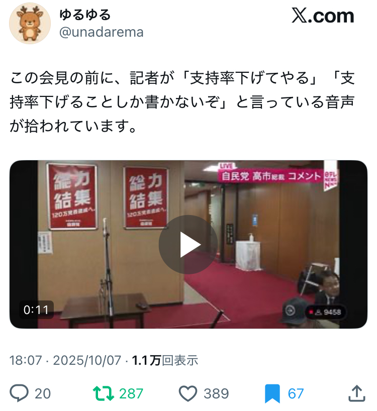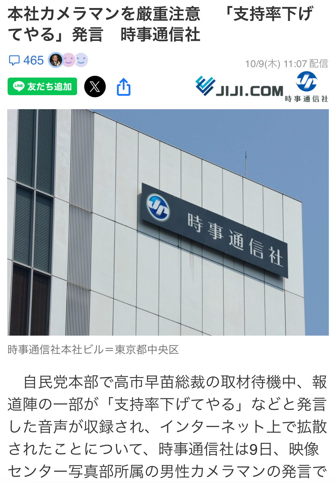 | … | 954無題Name名無し 25/10/09(木)12:24:53 IP:106.150.*(dion.ne.jp)No.2666607そうだねx3 1759980293569.jpg-(169075 B) >2025年10月9日 本社カメラマンを厳重注意「支持率下げてやる」発言 時事通信社 |