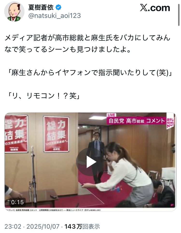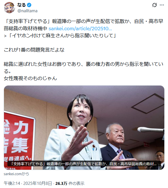 | … | 984無題Name名無し 25/10/09(木)14:37:23 IP:61.25.*(home.ne.jp)No.2666640そうだねx9>>このマスコミ記者の高市早苗さんへの「イヤホン付けて麻生さんから指示聞いたりして〜www」発言も同様だよな、女性を侮蔑してるからこそ、「女性の総裁なんて傀儡・お飾りに決まってて、真の権力者である男性の指示で動くんだw」みたいな女性蔑視思想を吐露してる |