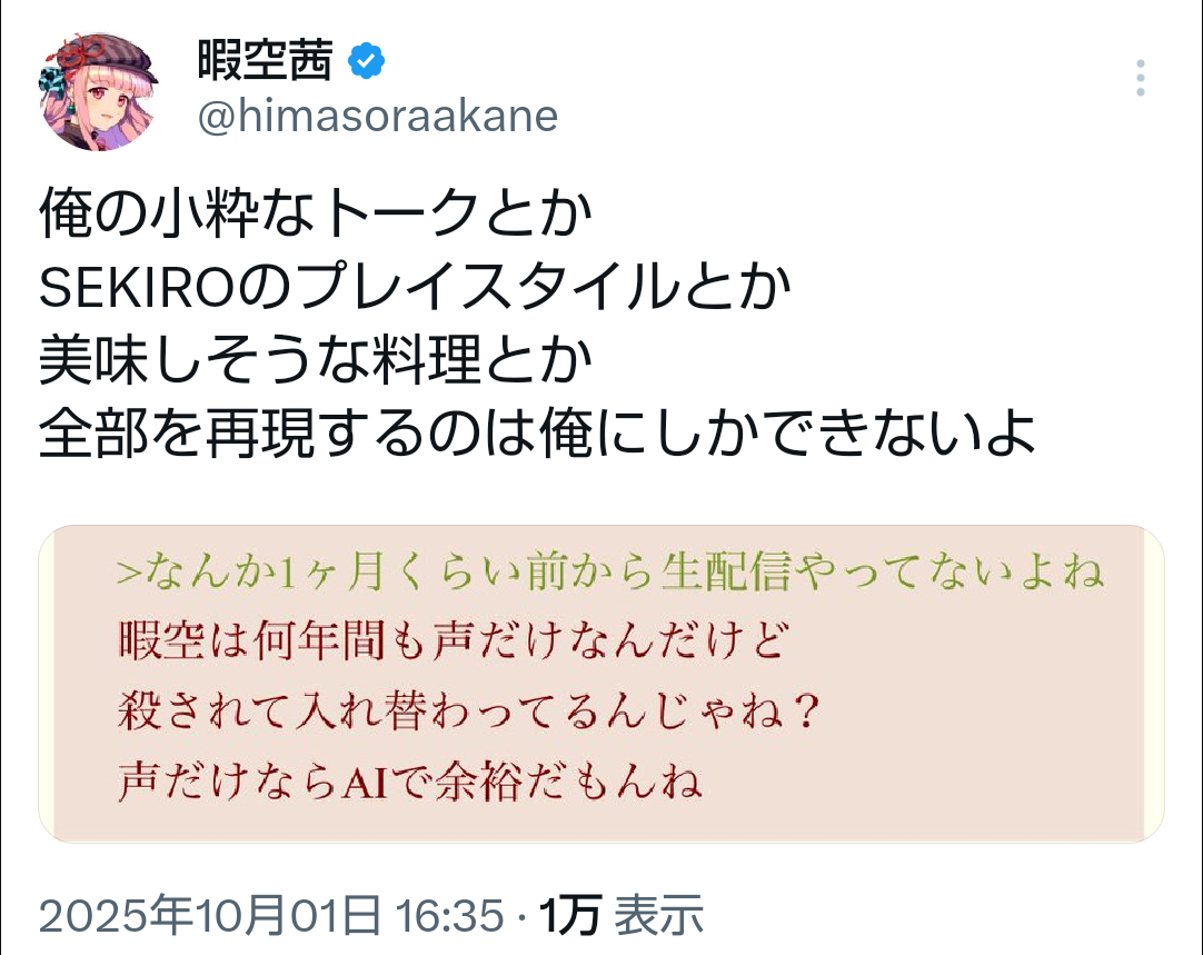 | … | 10無題Name名無し 25/10/05(日)20:24:53 IP:175.177.*(itscom.jp)No.2665315そうだねx2 1759663493676.png-(2635745 B) 暇空茜さん関連まとめ |