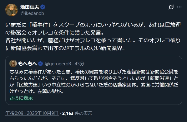 | … | 37無題Name名無し 25/10/05(日)21:29:03 IP:125.193.*(mesh.ad.jp)No.2665343そうだねx36そんなんだからマスコミは衰退したのさ |