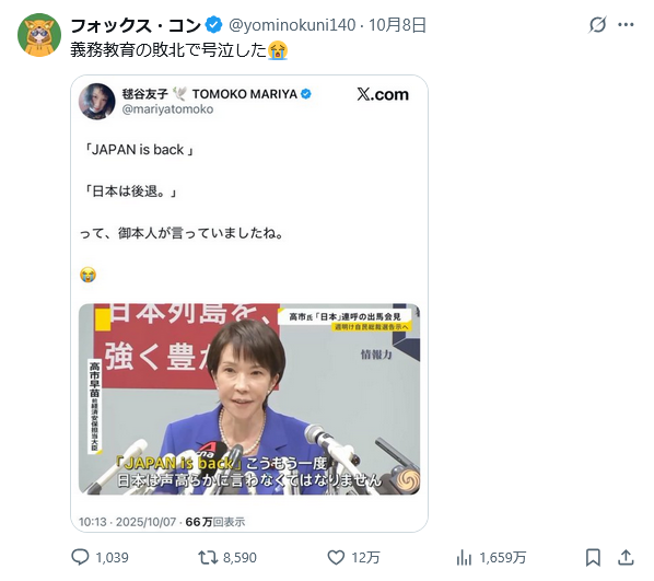 | … | 997無題Name名無し 25/10/09(木)16:11:26 IP:124.212.*(dion.ne.jp)No.2666659そうだねx9なんなら過去安倍さんが発言してるフレーズ |
