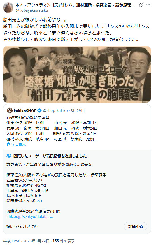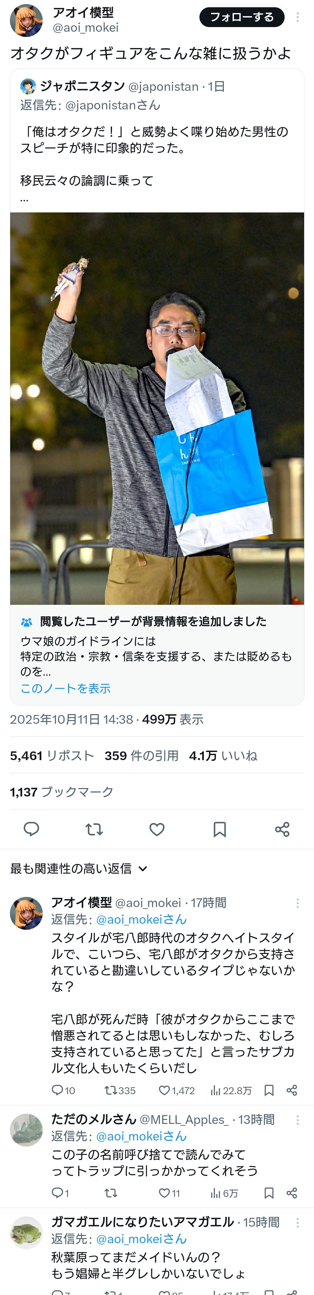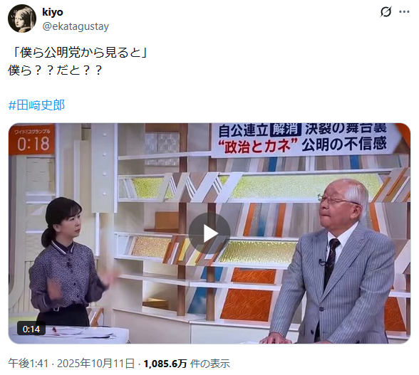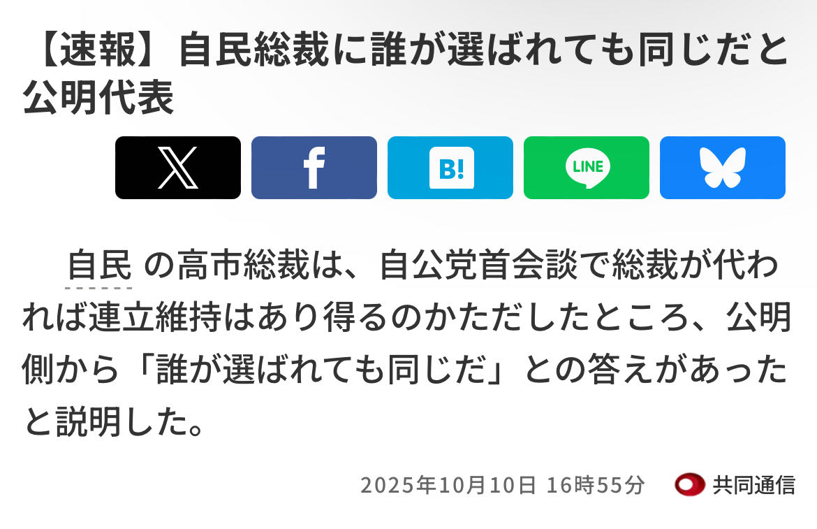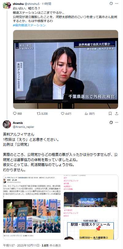| … | 913無題Name名無し 25/10/12(日)18:08:26 IP:49.109.*(spmode.ne.jp)No.2667889そうだねx5 1760260106308.jpg-(83849 B) >つか公明党が居なきゃ当選できない陣営の人なのかしら |