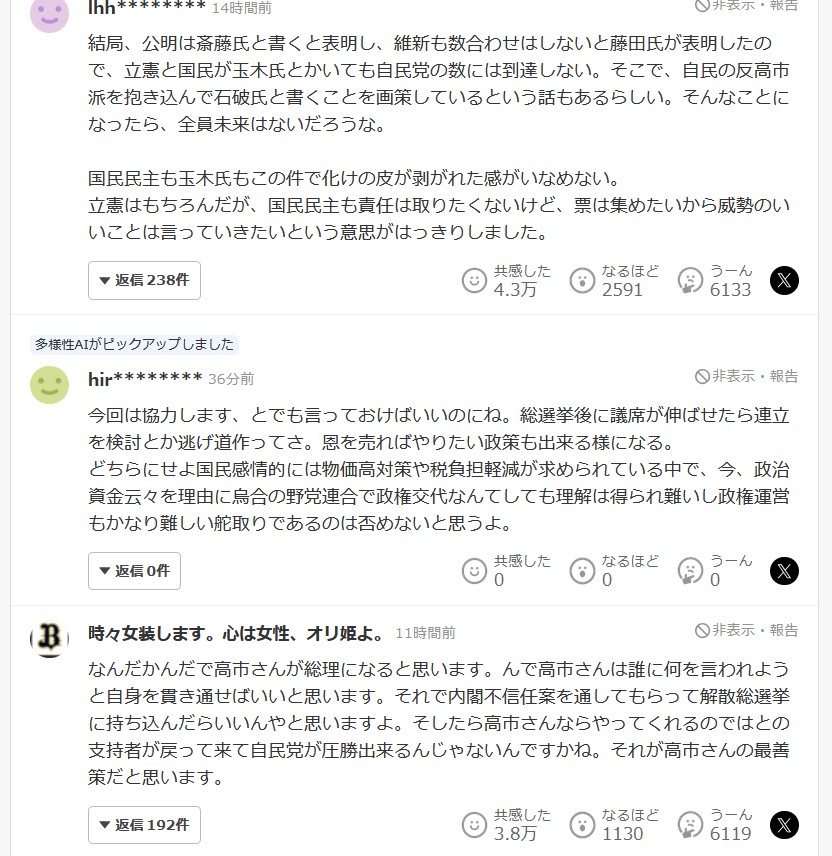 | … | 965無題Name名無し 25/10/12(日)23:34:29 IP:219.104.*(nuro.jp)No.2667974そうだねx35玉木がダメなら維新でもいいよみたいなこと言い出すあたり本当にポリシーやプライドがない |