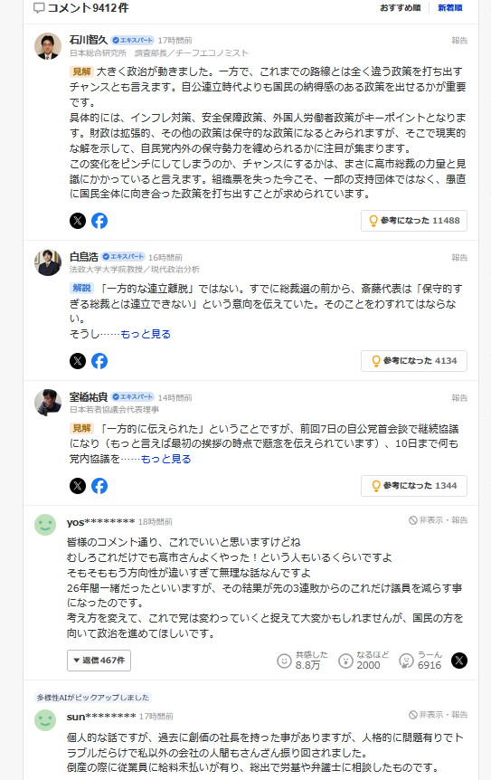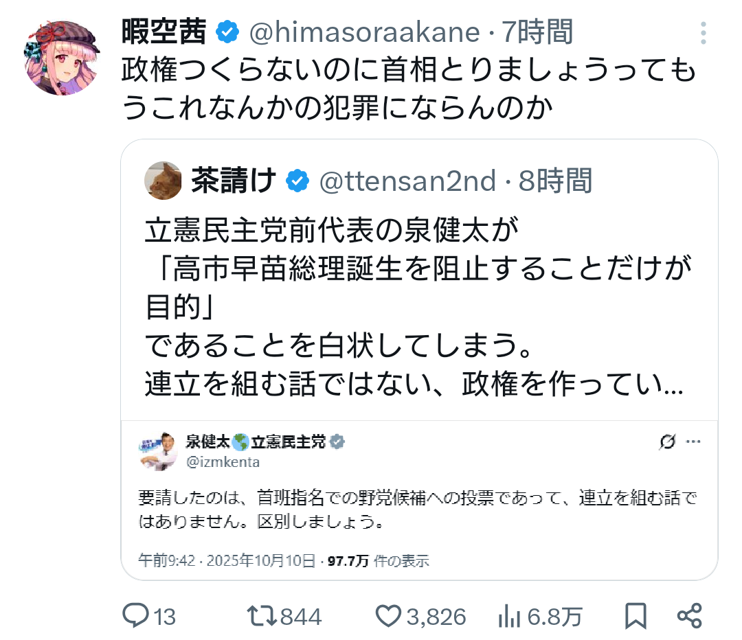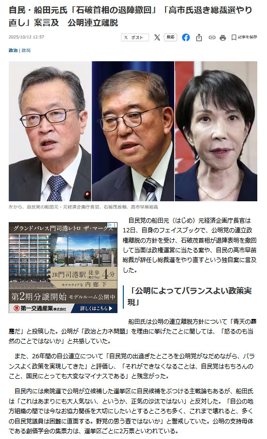 | … | 954無題Name名無し 25/10/12(日)22:38:37 IP:106.133.*(au-net.ne.jp)No.2667963そうだねx4>もっと連立与党内でかき回して邪魔せい派と連立解消して高市内閣阻止しろのシナ指示でかちあってんじゃないか? |