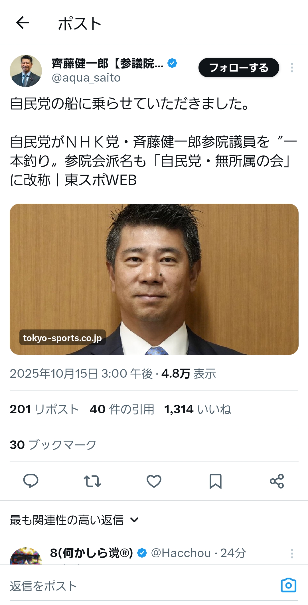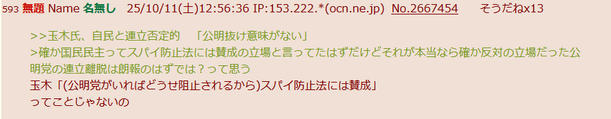 | … | 80無題Name名無し 25/10/13(月)16:21:03 IP:59.132.*(au-net.ne.jp)No.2668152+にょと強い繋がりのある議員や政党ってどうだったかな··· |