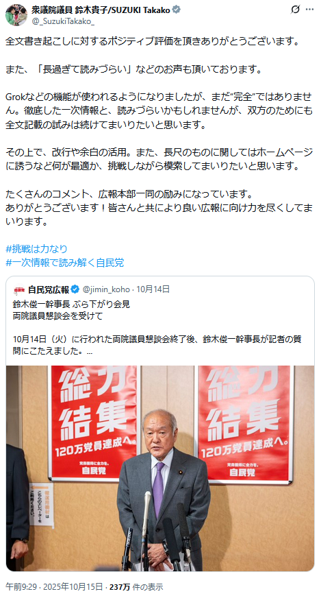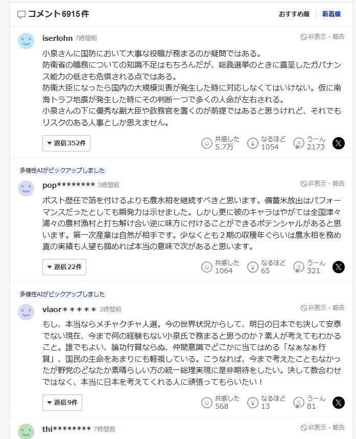 | … | 952無題Name名無し 25/10/18(土)00:17:58 IP:116.12.*(ccnw.ne.jp)No.2669441そうだねx26>小泉が当選したらこうしよう高市が当選したらこうしようって普通は前もって色んなプラン考えるべきなのに高市当選で今頃騒いでるのなんなの |