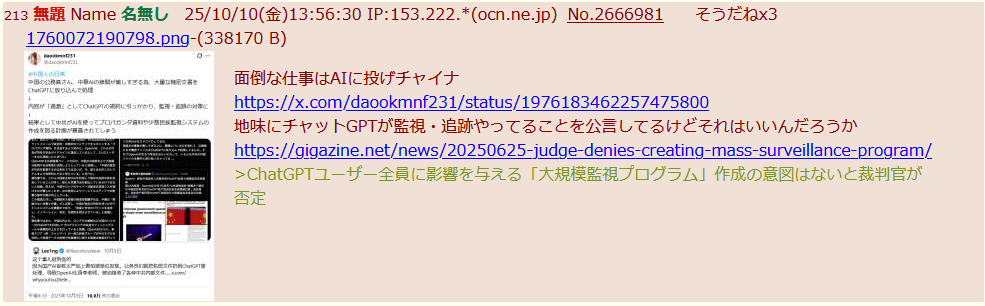 | … | 2無題Name名無し 25/10/13(月)12:06:33 IP:175.177.*(itscom.jp)No.2668024+▼監査結果の中継アーカイブ |