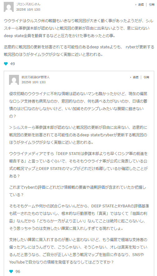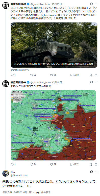 | … | 61無題Name名無し 25/10/13(月)14:59:33 IP:153.222.*(ocn.ne.jp)No.2668125そうだねx20 1760335173663.png-(206605 B) >ウクライナの言い分だと「兵站破壊」だそうです |