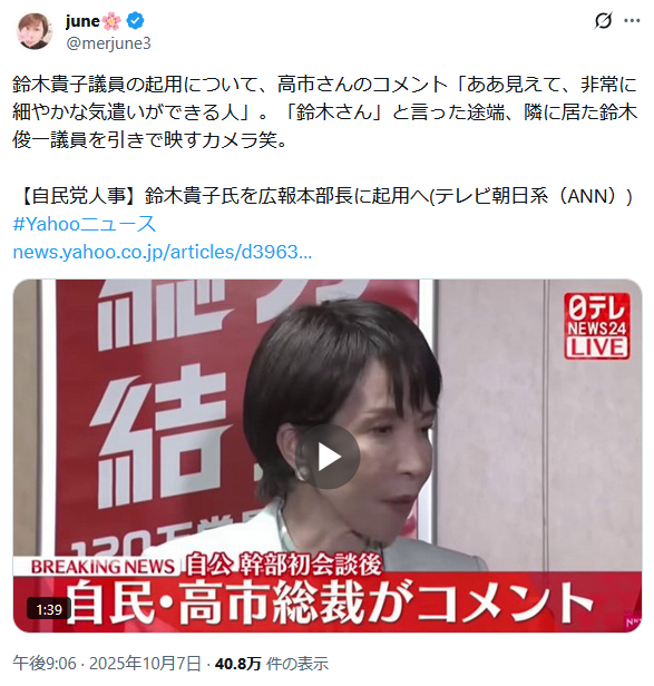 | … | 30無題Name名無し 25/10/13(月)12:53:53 IP:106.150.*(dion.ne.jp)No.2668052そうだねx23 1760327633865.png-(773962 B) 自民・高市総裁に約10日で4000人が新規党員申し込み 昨年は2位「期待に応えたい」 |