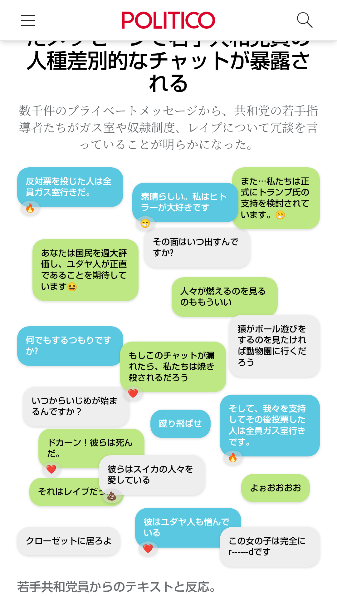 | … | 948無題Name名無し 25/10/17(金)23:34:21 IP:150.249.*(nuro.jp)No.2669437そうだねx14 1760711661252.png-(416770 B) 共和党の若手議員たちが差別発言したり従わない奴らはガス室送りにするぞってテレグラムのチャットで言ってましたぞーってポリティコの記事 |