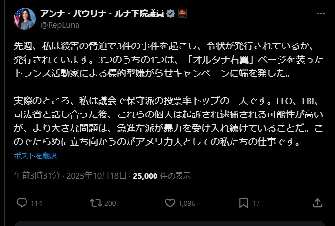 | … | 982無題Name名無し 25/10/18(土)08:08:02 IP:14.13.*(enabler.ne.jp)No.2669478そうだねx5 1760742482410.jpg-(84583 B) 米国のアンナ・パウリナ・ルナ下院議員が自身に対する3件の脅迫を報告(英語) |