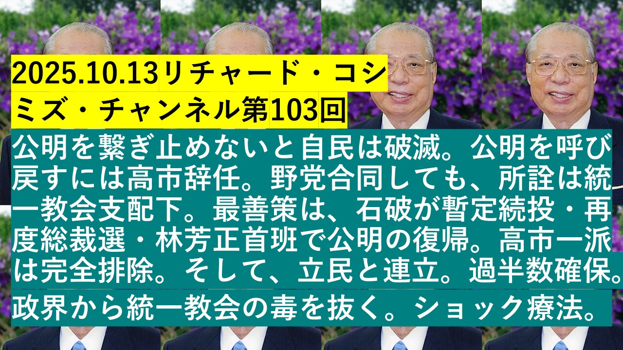 2025.10.13 リチャード・コシミズ・チャンネル第103回「公明を繋ぎ止めないと自民は破滅。公明を呼び戻すには高市辞任。野党合同しても、所詮は統一教会支配下。最善策は、石破が暫定続投・再度総裁選・林芳正首班で公明の復帰。高市一派は完全排除。そして、立民と連立。過半数確保。政界から統一教会の毒を抜く。ショック療法」https://live.nicovideo.jp/watch/lv348935546