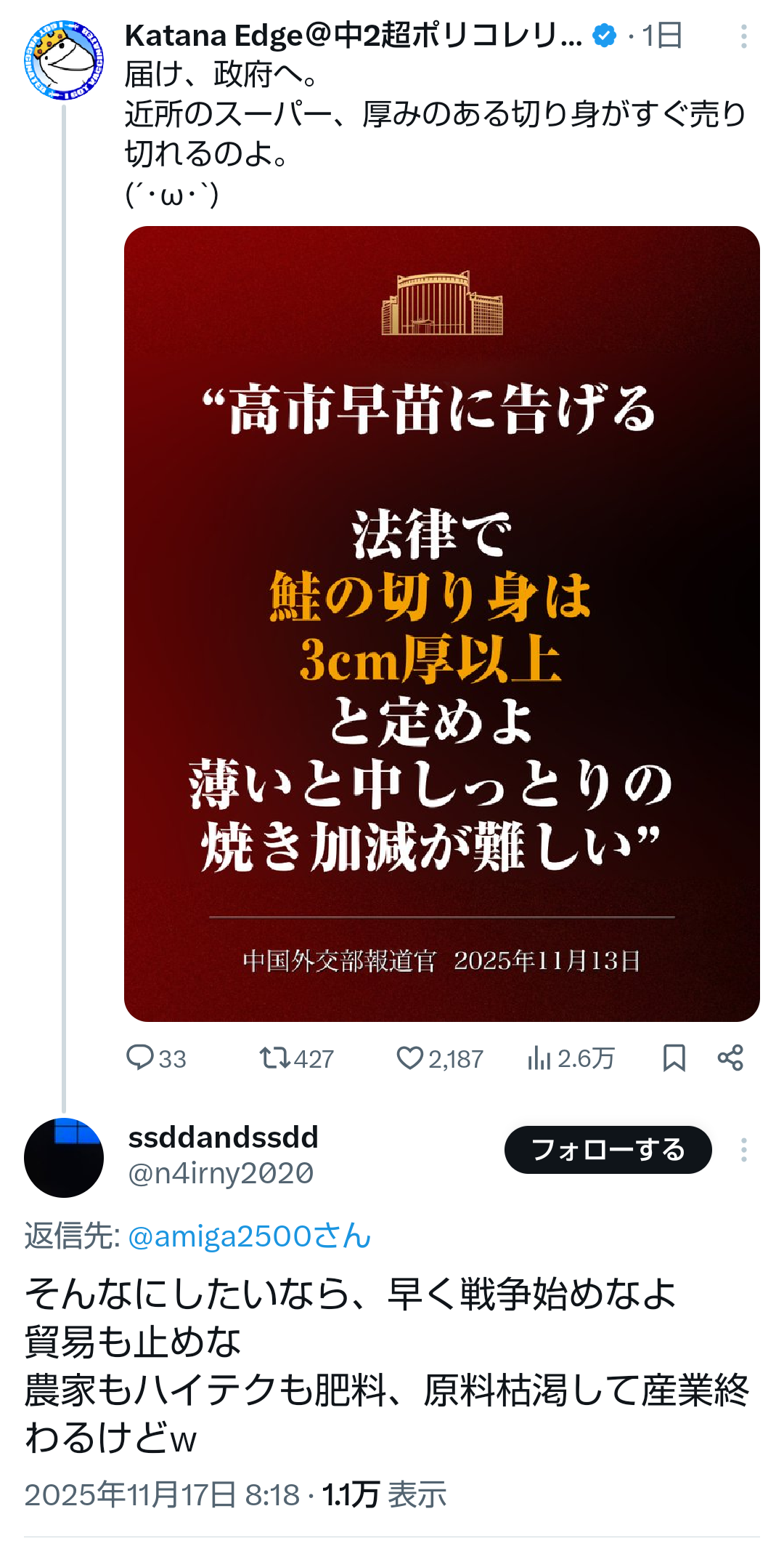 | … | 621無題Name名無し 25/11/18(火)09:37:53No.760555そうだねx1もしかして台湾有事を中国の国内問題だと言わせるのを諦めてない? |