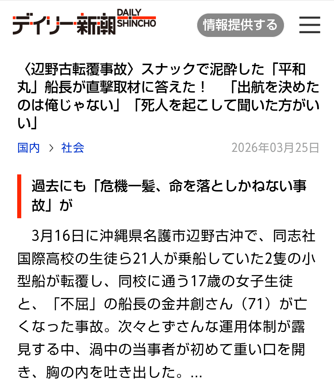 | … | 345無題Name名無し 26/03/25(水)14:18:32No.789197+ 1774415912755.png-(241598 B) >スナックで泥酔した「平和丸」船長が直撃取材に答えた! 「出航を決めたのは俺じゃない」「死人を起こして聞いた方がいい」 |