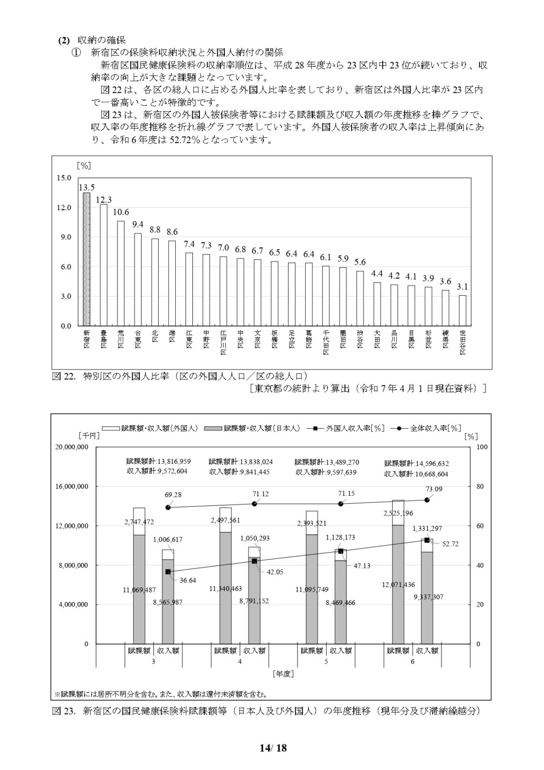 | … | 1無題Name名無し 26/04/22(水)17:30:02No.793514+東京都新宿区は、外国人の国民健康保険料の未納率が高いことを受け、今年度から初年度の保険料を1年分前納する制度を導入した。外国人の収納率は約53%と日本人の約77%を大きく下回り、制度への理解不足や帰国後の徴収困難が背景にある。 |
