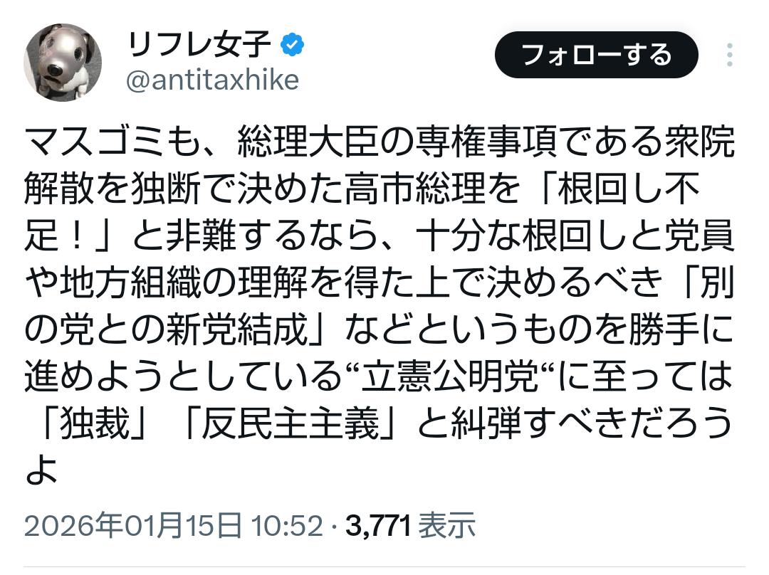 | … | 991無題Name名無し 26/01/15(木)12:48:30No.770984+>Xだと別世界を見てるかの如く高市叩きをよく見かける |