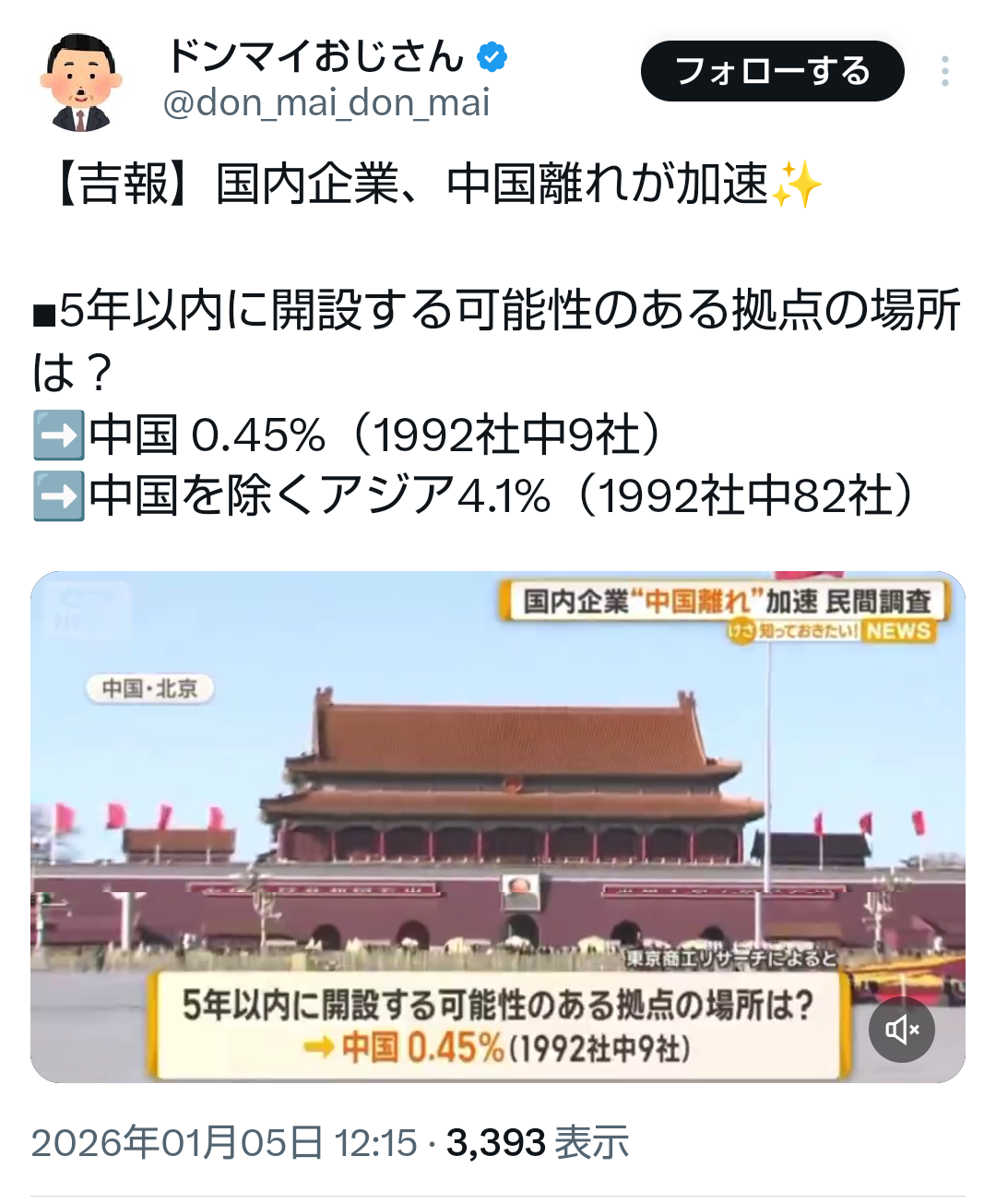 | … | 242無題Name名無し 26/01/05(月)13:18:12No.768829+ 1767586692225.png-(627483 B) >【吉報】国内企業、中国離れが加速 |
