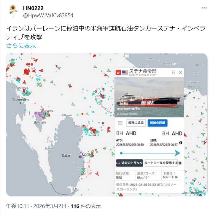 | … | 11無題Name名無し 26/03/02(月)22:08:16No.784598+ペルシャ湾に日本関係の船舶43隻 日本人乗組員は23人 |