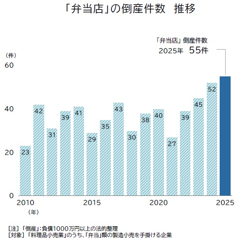 2025年に発生した、仕出しやテイクアウトを中心とした「弁当店」の倒産(負債1000万円以上、法的整理)は55件となった。2024年の件数(52件)を上回り、2年連続で過去最多を更新した。個人店の閉業などを含めると、実際はより多くの弁当店が市場から退出したとみられ、原材料高などに耐え切れない中小弁当店の淘汰が進んだ。