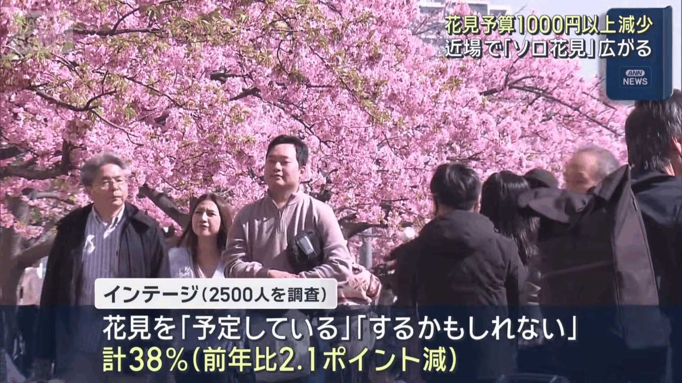 「インテージ」によりますと、花見を「予定している」「するかもしれない」と答えた人の割合は合わせて38%で、去年より2.1ポイント下がりました。