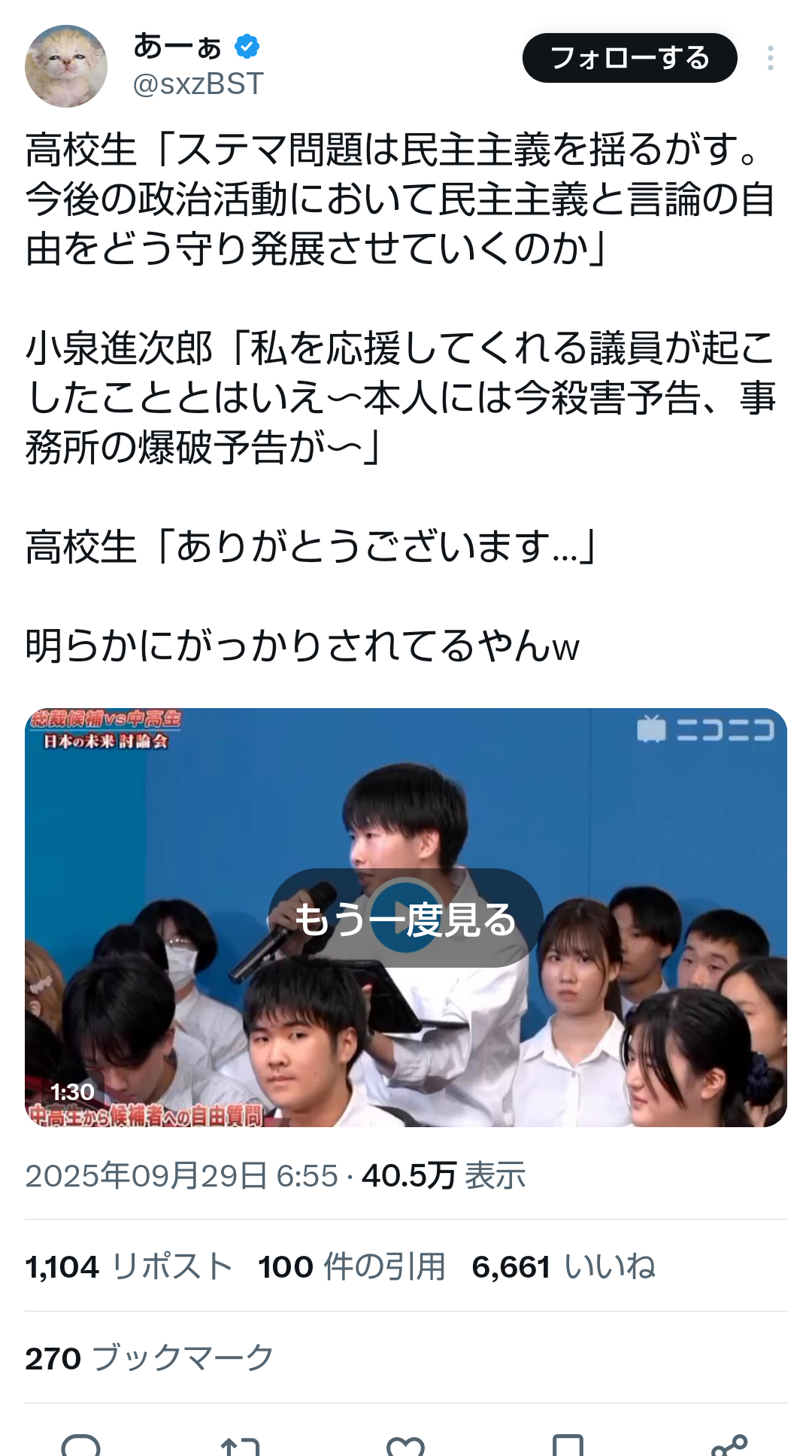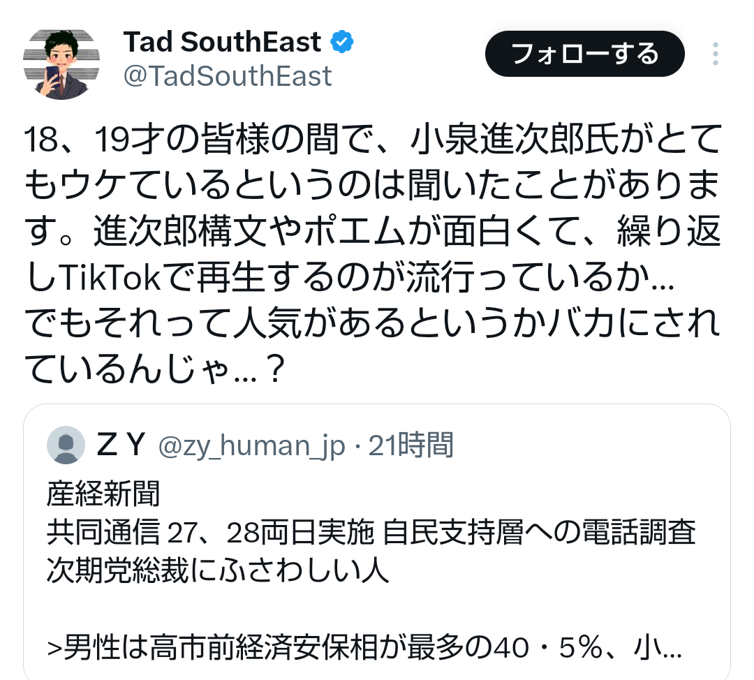 … | 28無題Name名無し 25/09/29(月)09:29:52No.747865+まあ中高生なんて総裁選の票を持ってないからどうでもいいだろうし仕方無いな |