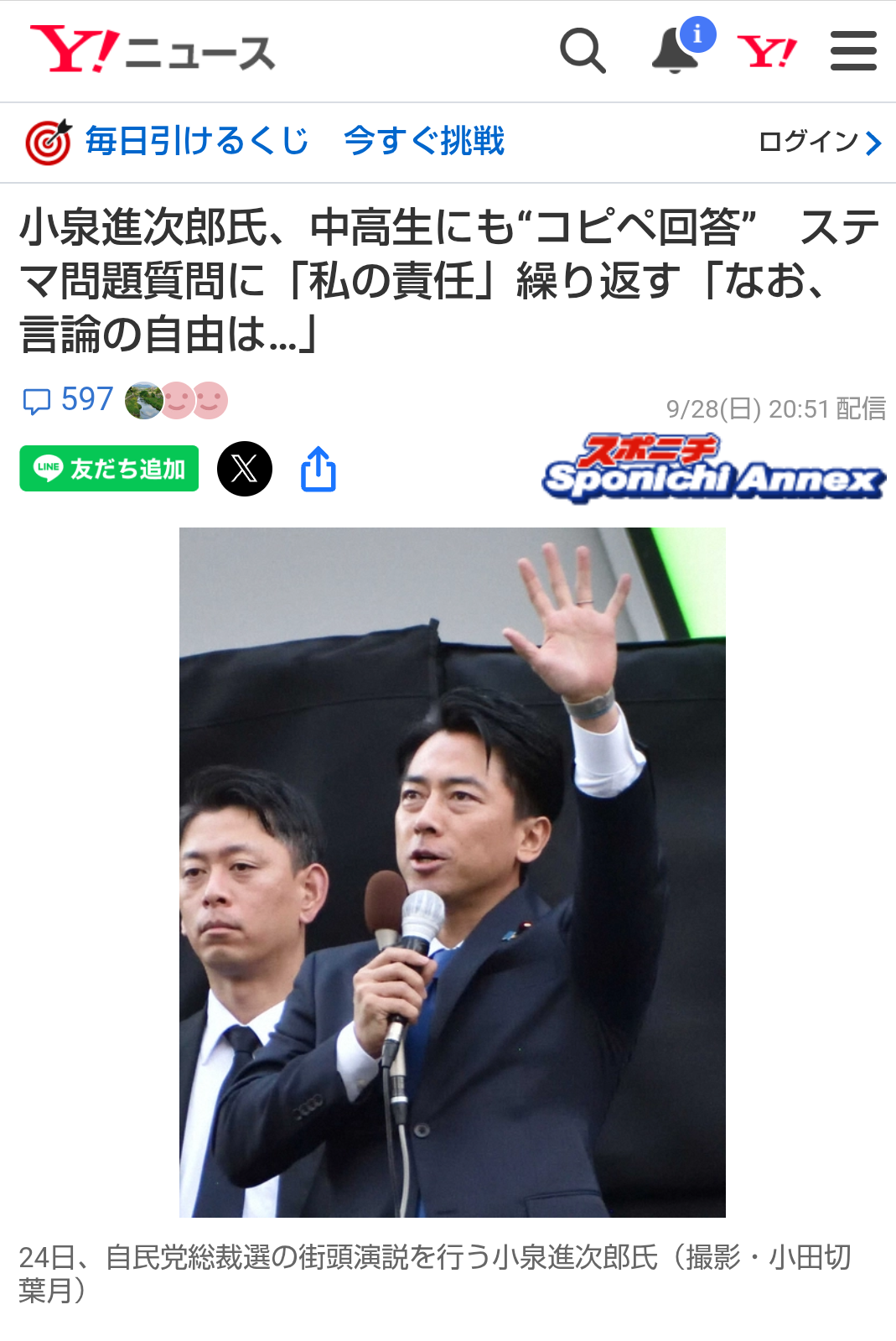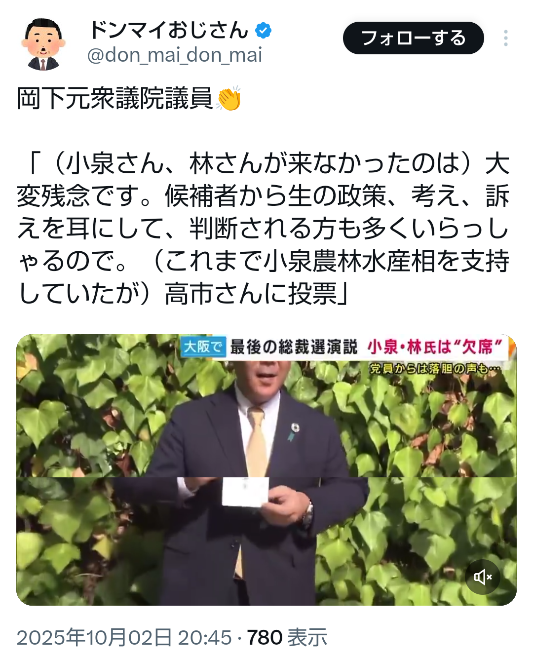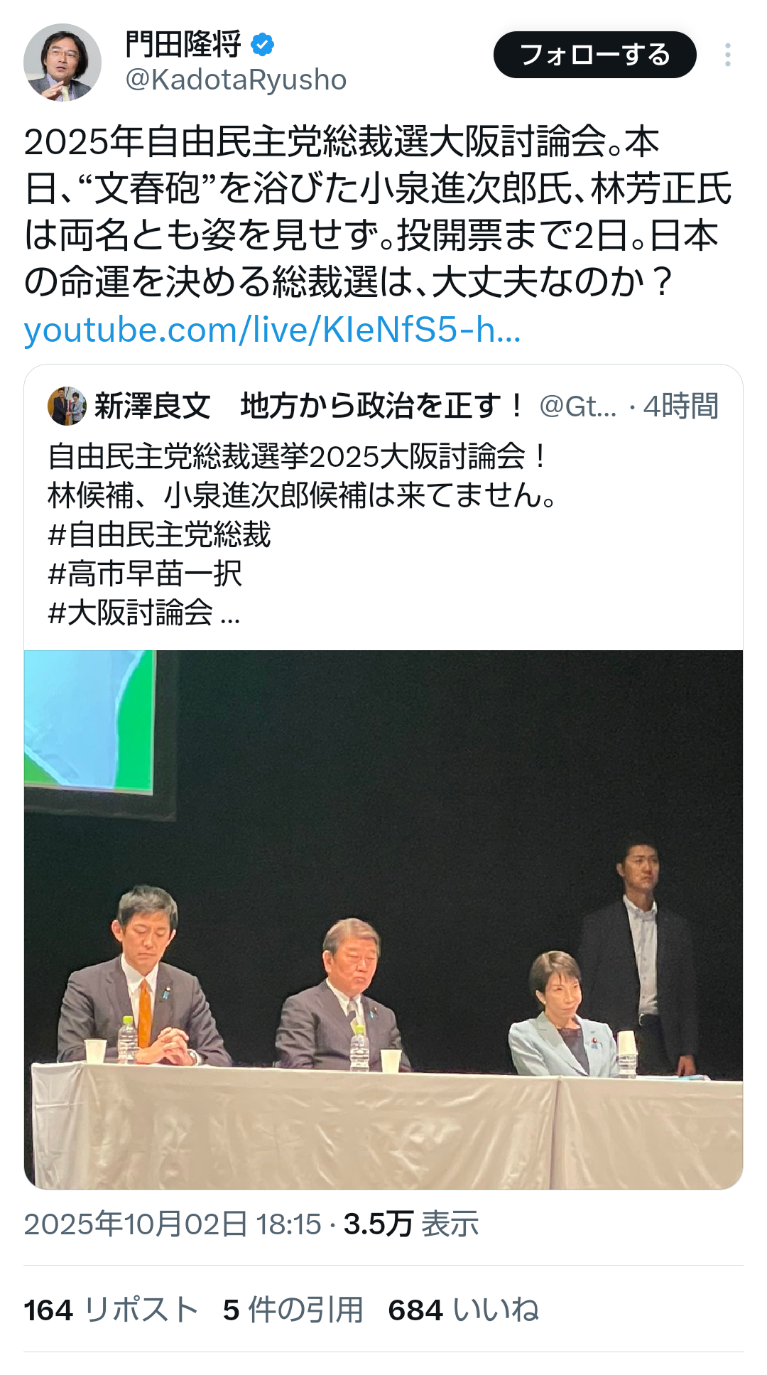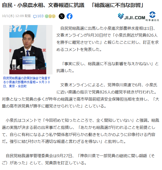 … | 557無題Name名無し 25/10/02(木)22:19:28No.748435+>小泉・林氏が演説会欠席 公務優先、他陣営から不満―自民総裁選 |