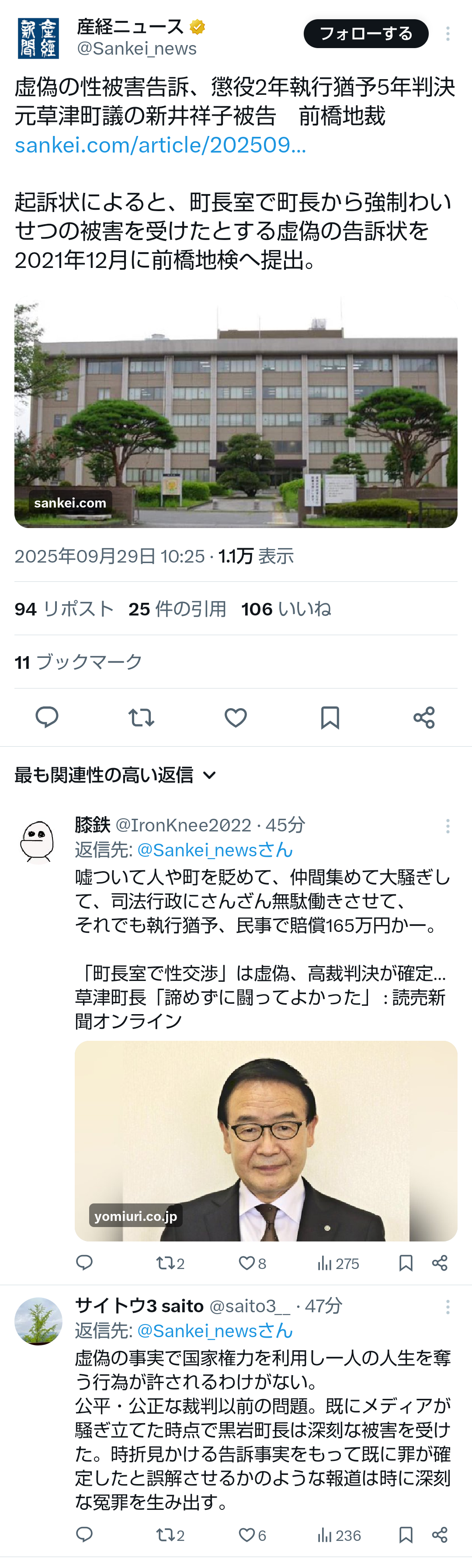 … | 45無題Name名無し 25/09/29(月)11:38:59No.747882そうだねx2 1759113539560.png-(1386704 B) ![]() >虚偽の性被害告訴、懲役2年執行猶予5年判決 元草津町議の新井祥子被告 前橋地裁 |