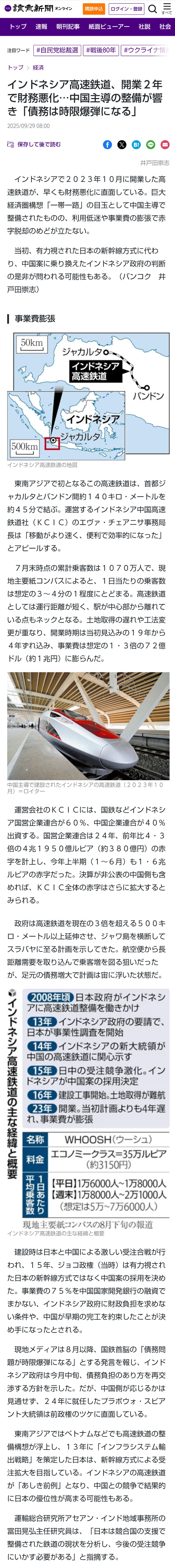 … | 48無題Name名無し 25/09/29(月)12:24:35No.747885+ 1759116275915.jpg-(882636 B) ![]() >インドネシア高速鉄道、開業2年で財務悪化…中国主導の整備が響き「債務は時限爆弾になる」 |