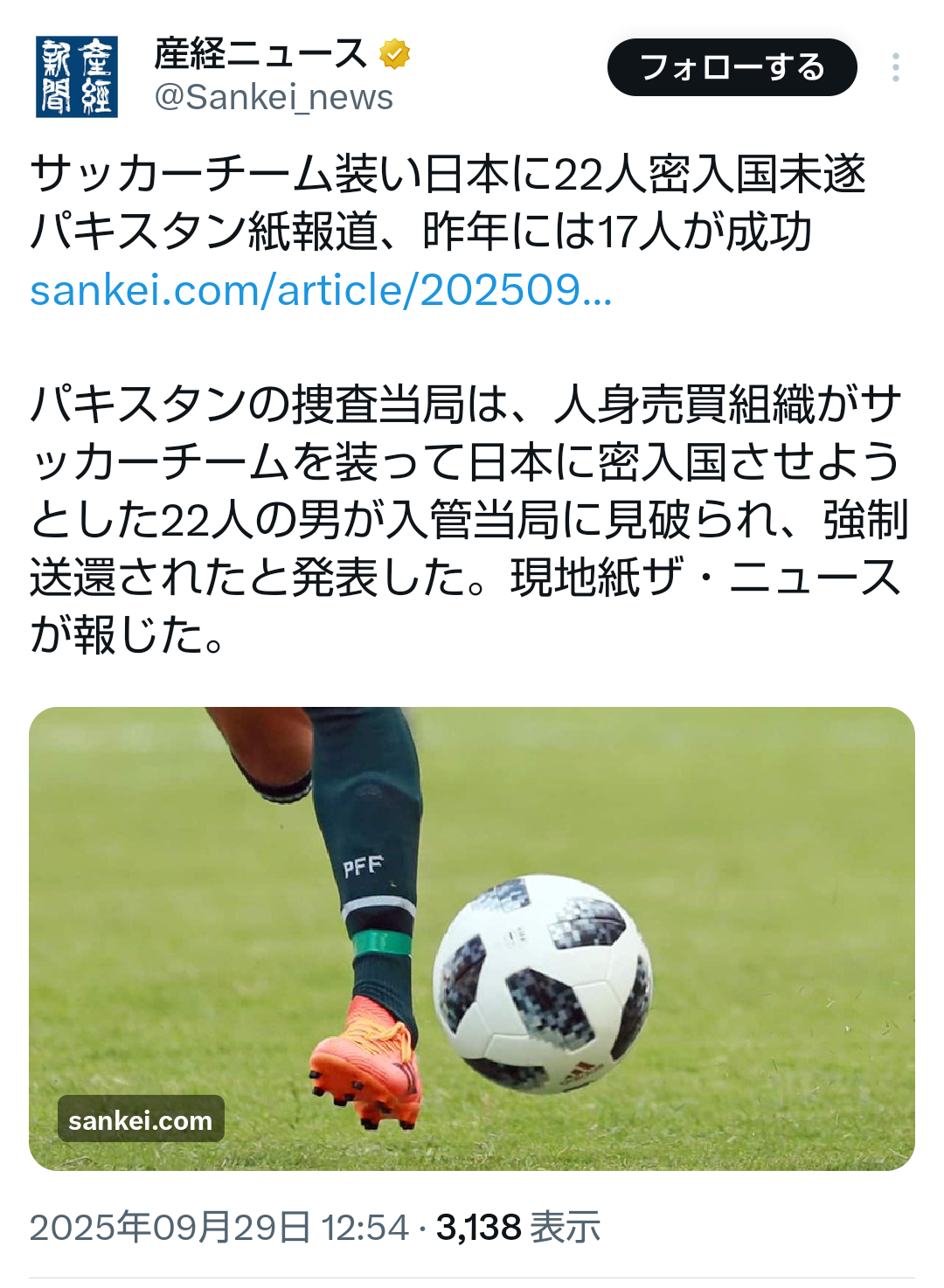… | 56無題Name名無し 25/09/29(月)13:09:41No.747893そうだねx2 1759118981606.png-(682919 B) ![]() >サッカーチーム装い日本に22人密入国未遂 パキスタン紙報道、昨年には17人が成功 |