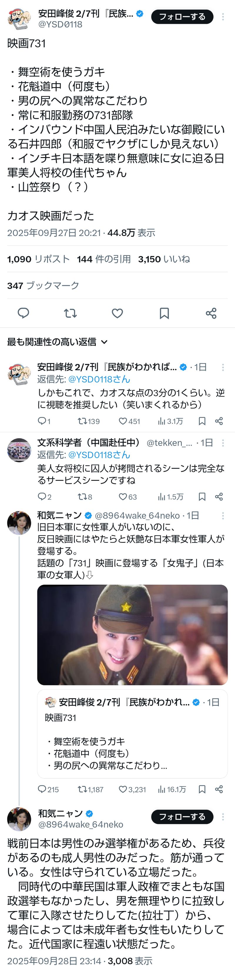 … | 33無題Name名無し 25/09/29(月)10:34:06No.747870+>史実通りにしたらただの防疫部隊になっちゃう! |