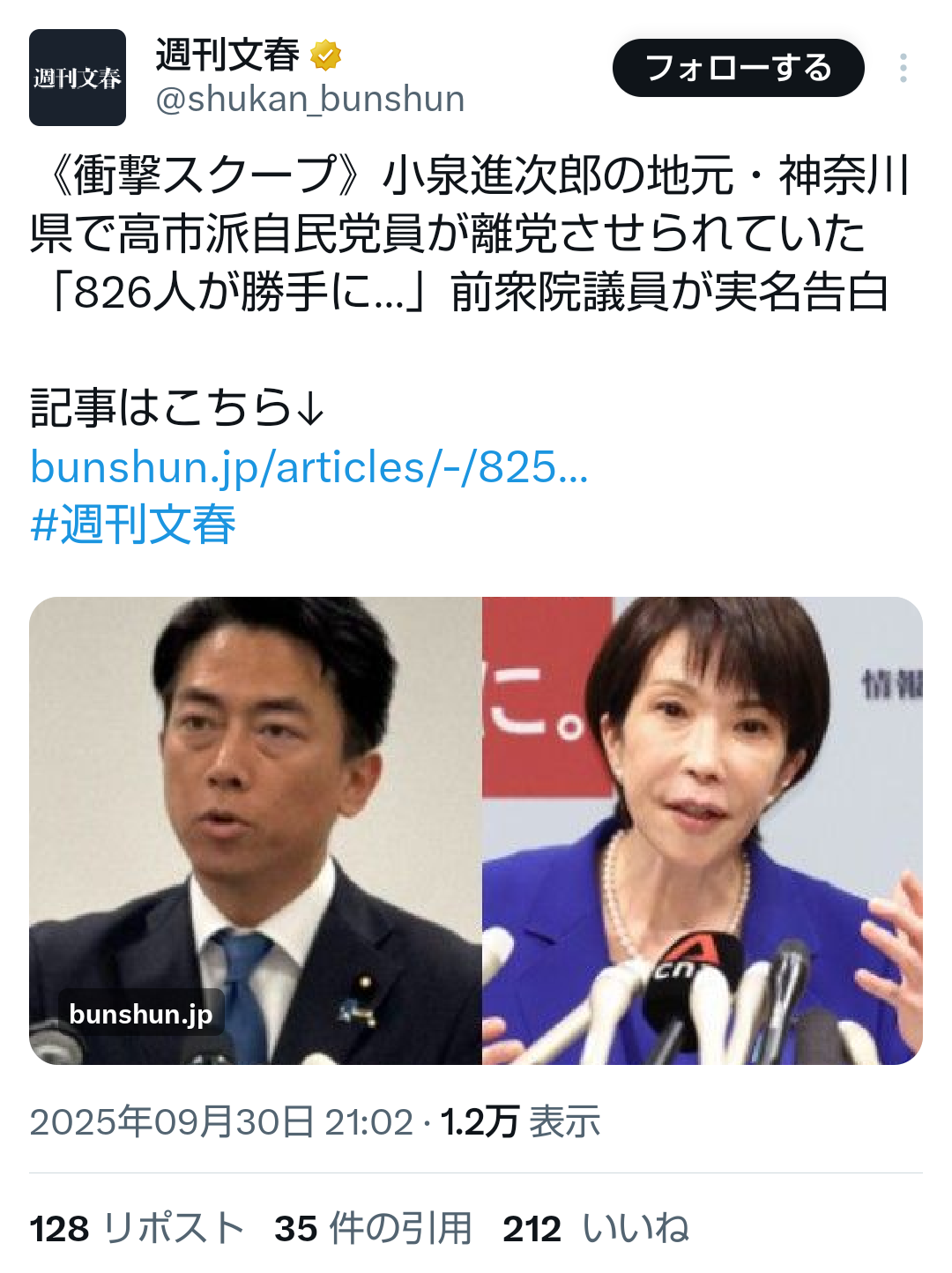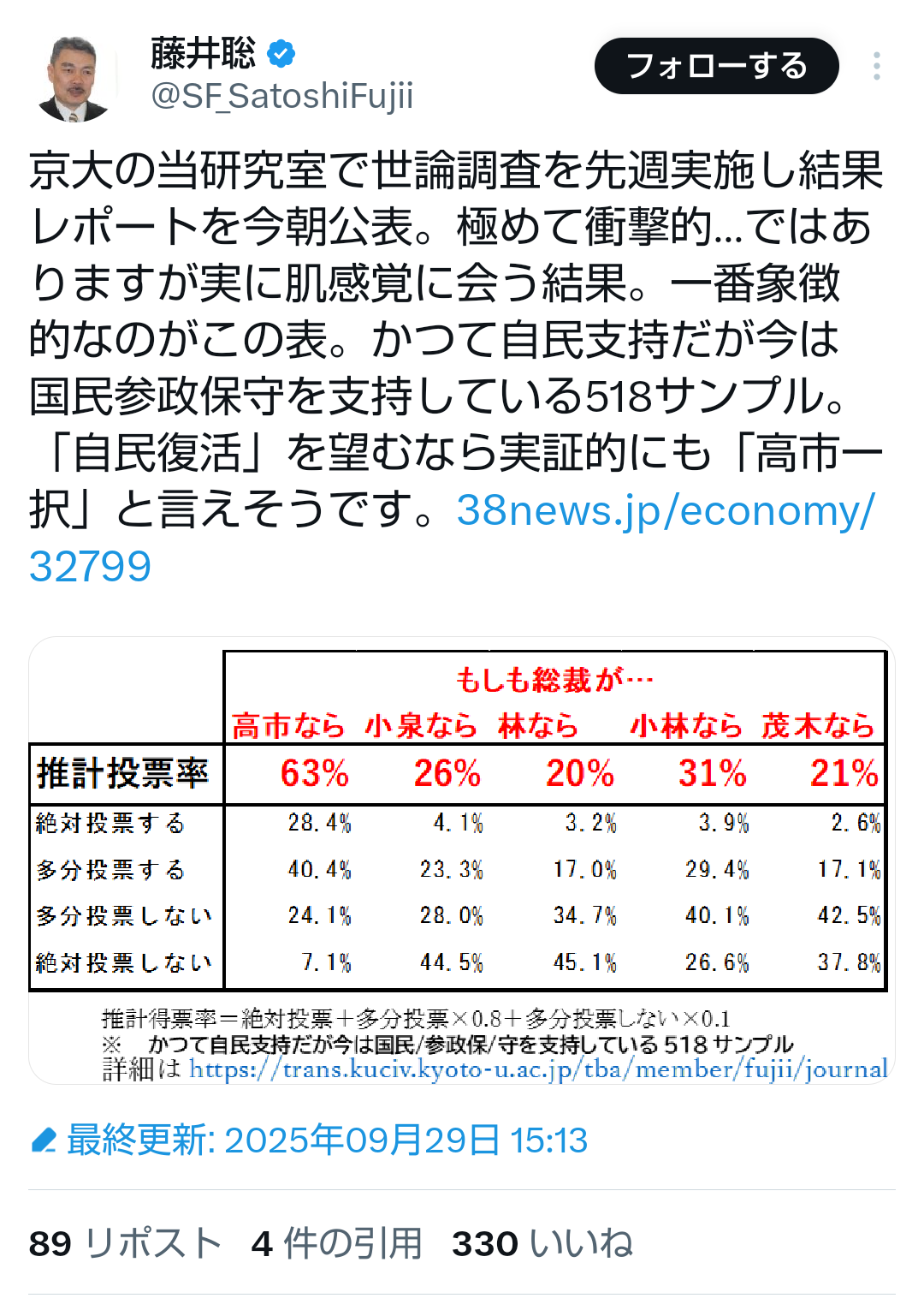 … | 81無題Name名無し 25/09/29(月)18:02:35No.747923そうだねx2>>【総裁選全国調査が示した衝撃の事実】「高市総裁」なら参政・国民に流れた票の3分の2が戻るが「小泉・林総裁」なら殆ど戻らず自民党離れもさらに加速する【藤井聡】 |
