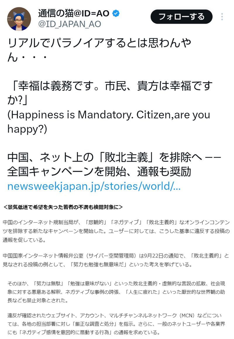 … | 73無題Name名無し 25/09/29(月)16:51:43No.747911+ 1759132303931.jpg-(132248 B) ![]() >中国、ネット上の「敗北主義」を排除へ ――全国キャンペーンを開始、通報も奨励 |