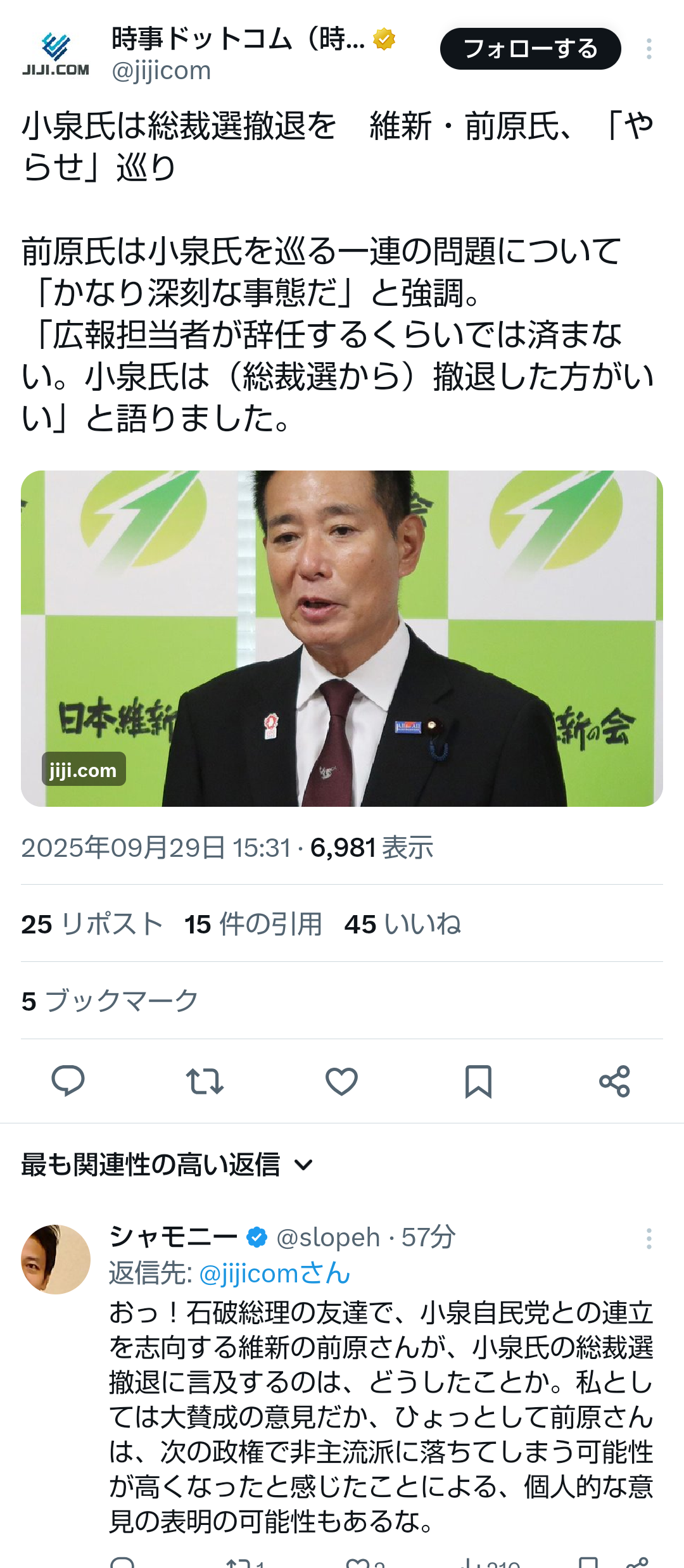 … | 75無題Name名無し 25/09/29(月)17:22:49No.747914+ 1759134169605.png-(862006 B) ![]() >小泉氏は総裁選撤退を 維新・前原氏、「やらせ」巡り |