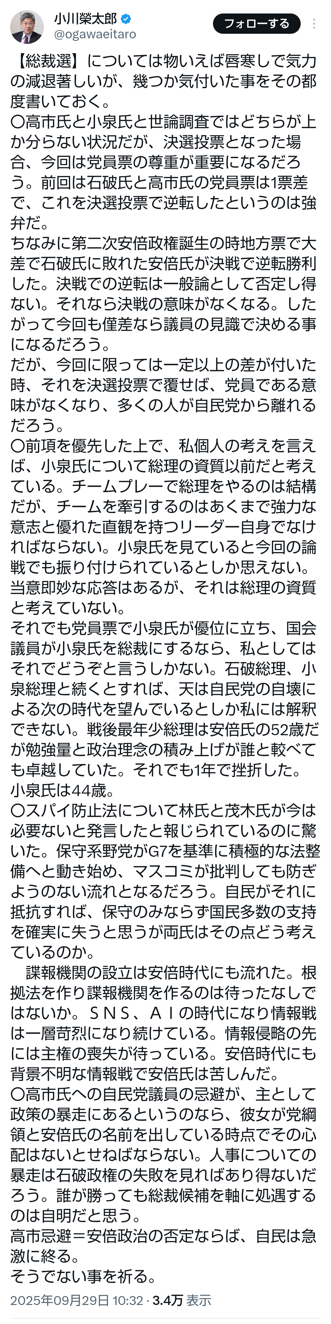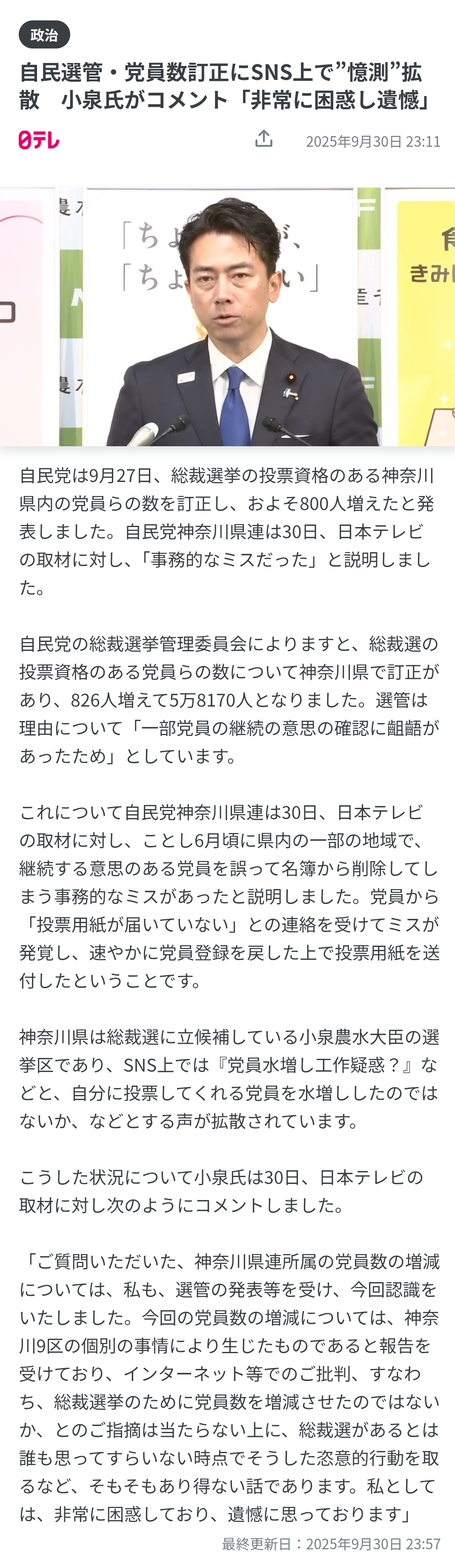… | 57無題Name名無し 25/09/29(月)13:16:39No.747894そうだねx2>>そして「今後2度とこういったことがないように、しっかりと陣営の中で徹底させて再発防止に努め、最後まで緊張感を持って臨みたいと思います」と総裁選への決意を改めて口にし、「なお、言論の自由とかの話もありましたが、私は基本的に言論の自由、表現の自由、これは尊重されるべきだと思うので、その規制については最小限であるべきだという立場です」と言論、表現の自由について自身の立場を説明した。 |