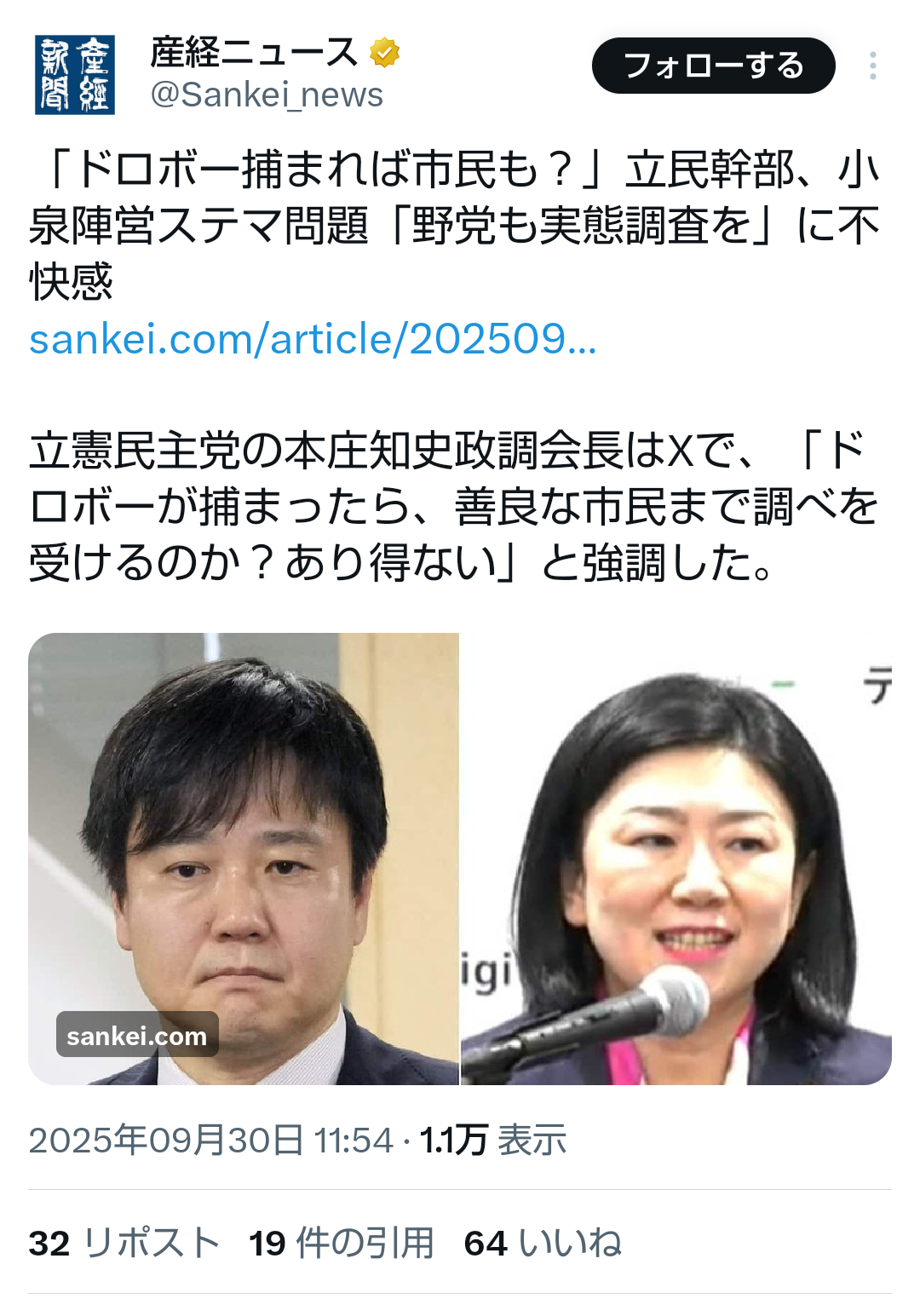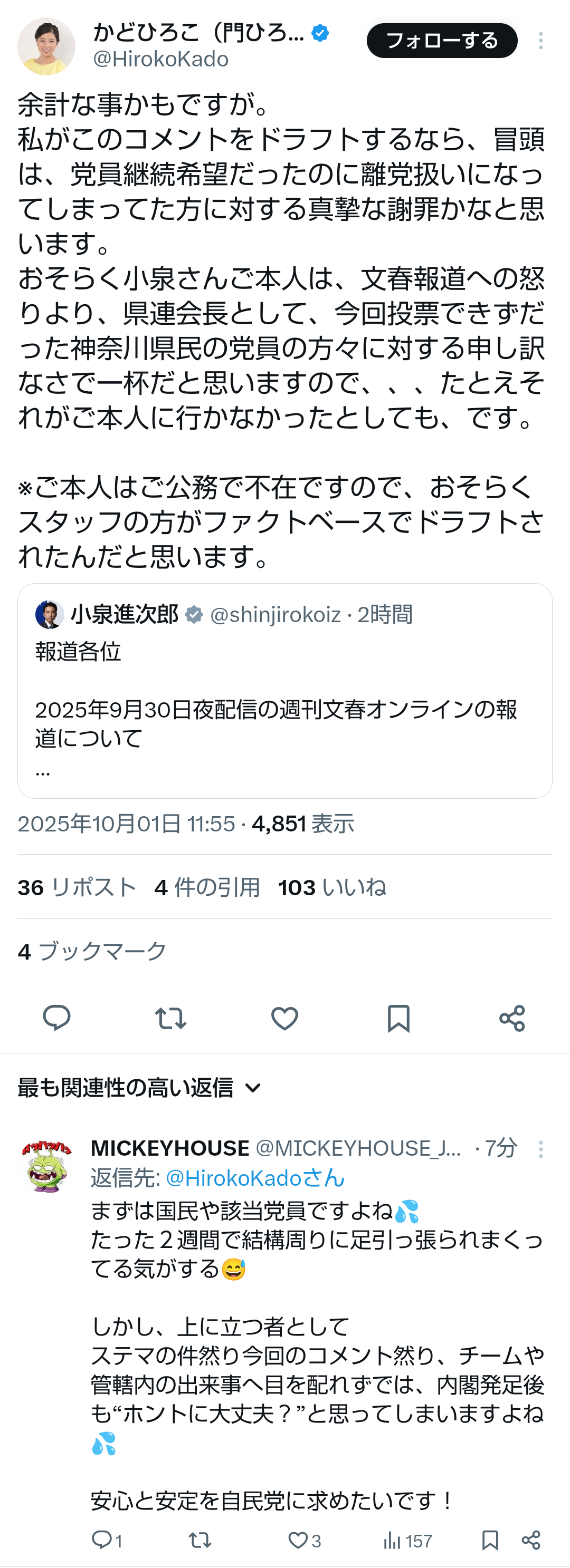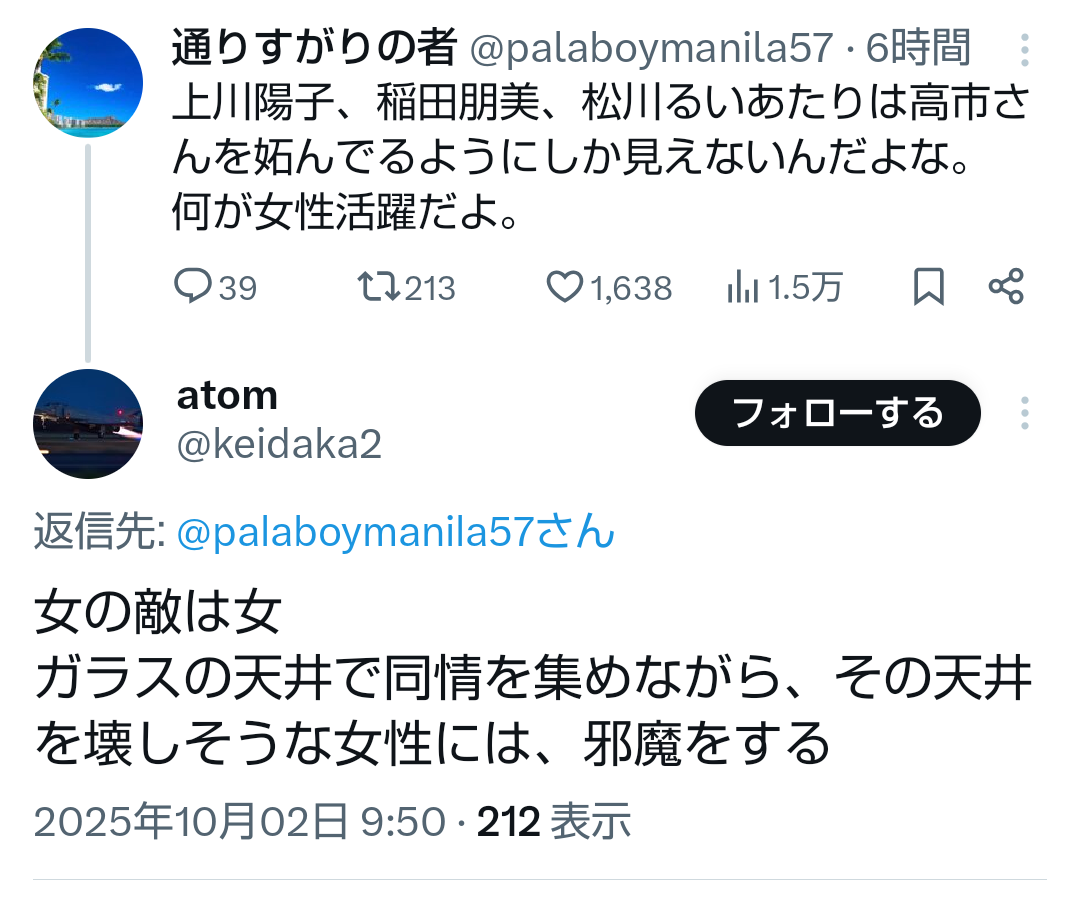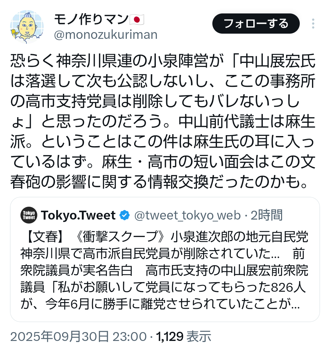 … | 64無題Name名無し 25/09/29(月)13:50:20No.747901+>石破辞めるなのSNS工作は牧島かれんがやってたんだろ?とか既に言われてる |