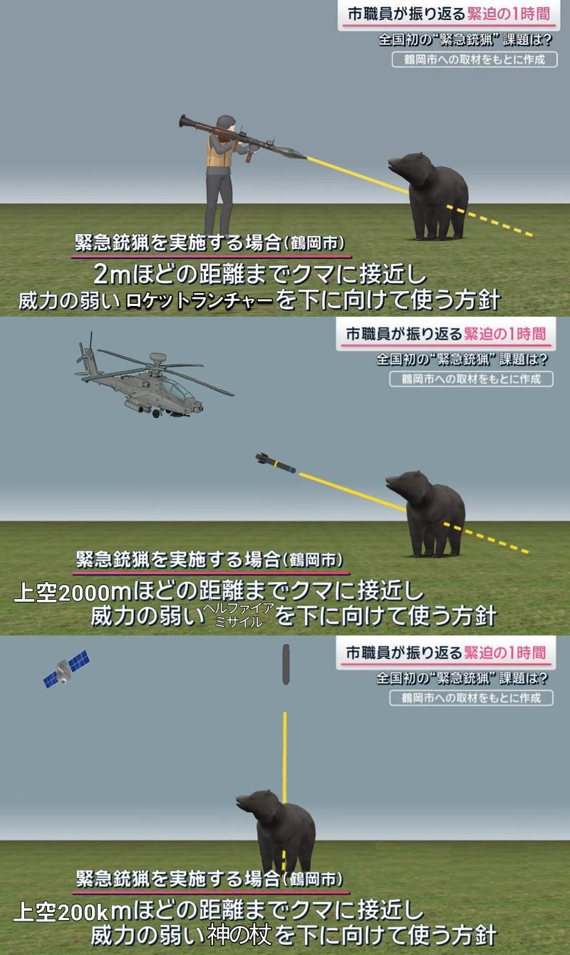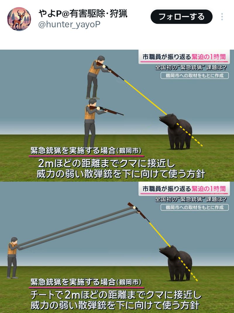 … | 8無題Name名無し 25/09/29(月)01:59:26No.747843+なんで駆除方法に制限付けてハンターの方の危険度を無意味に上げるんだろうなぁ…それこそ政府で殺傷力の高いライフルやグレネード等装備した陸自のチームを複数隊編成して銃火器の使用許可を付与して対応って道も有るだろうに費用対効果等は一切考えてない妄想では有るけどさ |