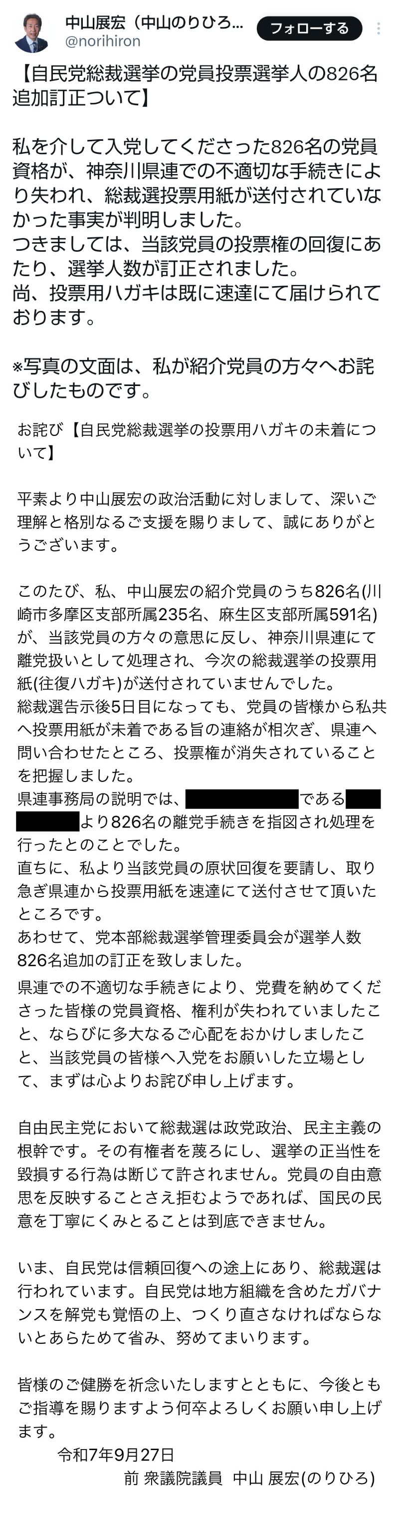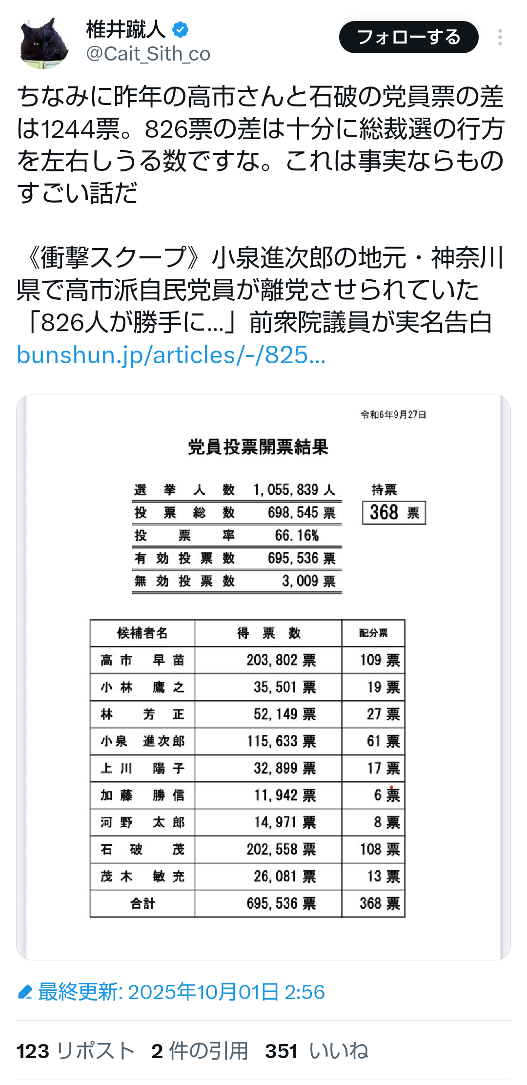 … | 509無題Name名無し 25/10/02(木)16:55:09No.748382そうだねx1 1759391709894.jpg-(253679 B) ![]() そういえば進次郎支持の議員とかがたった800人なら影響ないとか言ってたんだけど去年の党員票数はトータルだと1000くらいなんだよね高市、石破の差って |