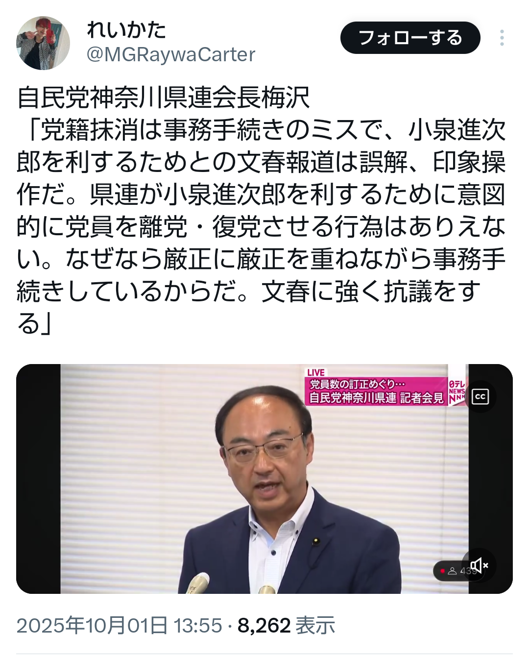 … | 43無題Name名無し 25/09/29(月)11:15:41No.747880そうだねx2>選挙管理委員会の逢沢一郎委員長 沈黙 |
