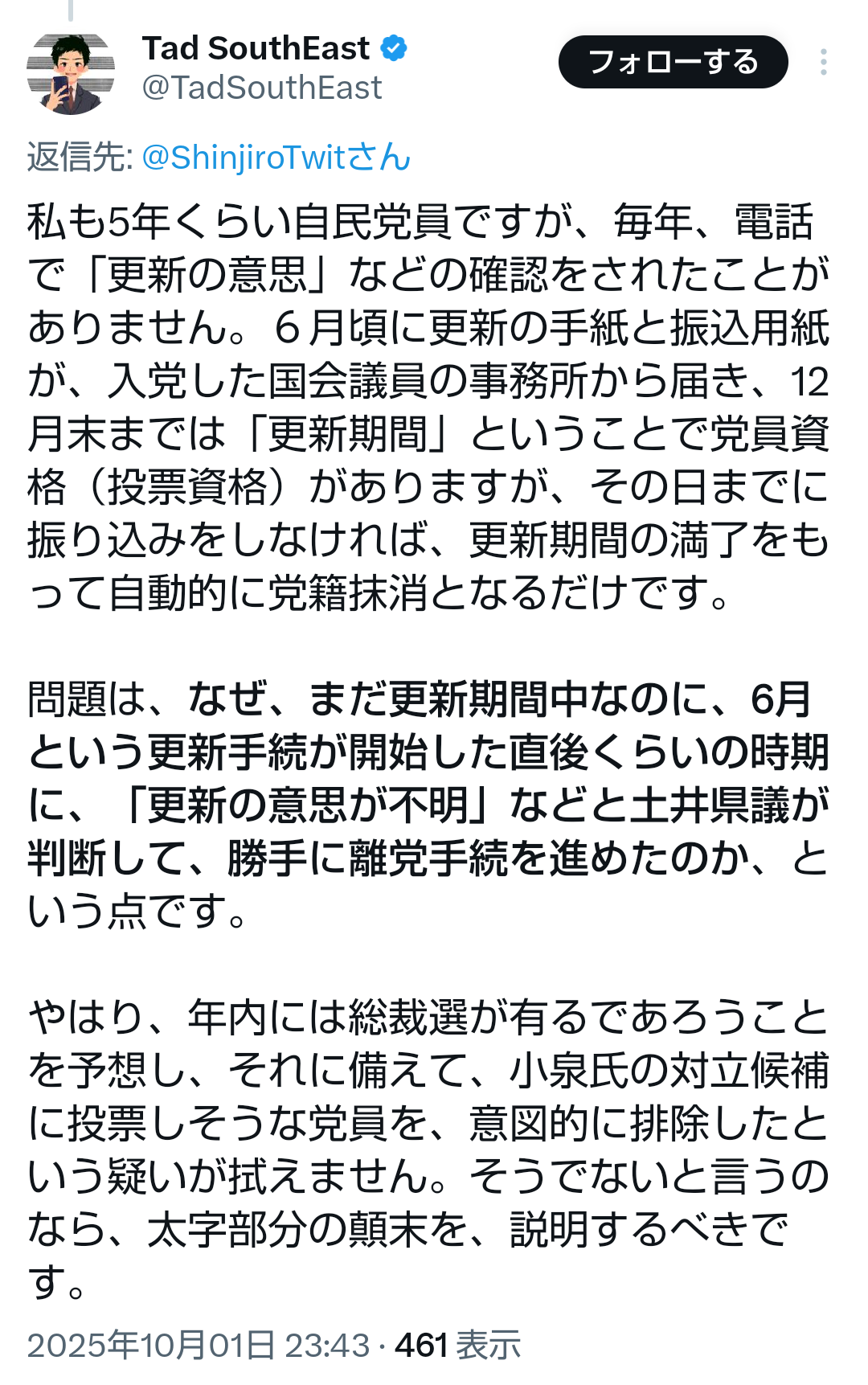 … | 549無題Name名無し 25/10/02(木)21:31:50No.748427そうだねx1急な総裁選でーとか手続きミスがーってゴニョゴニョして党員に投票させない作戦なのか |