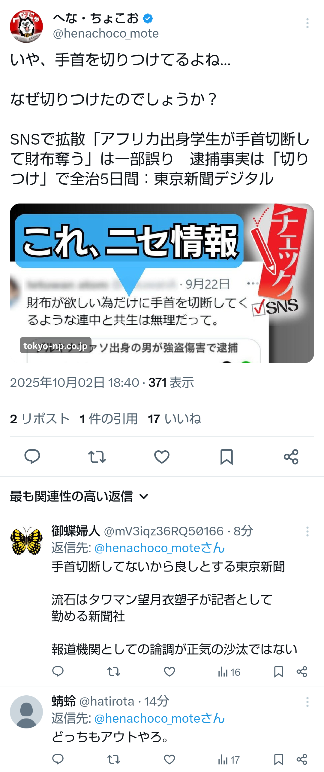 … | 525無題Name名無し 25/10/02(木)19:00:28No.748402+ 1759399228183.png-(792865 B) ![]() >SNSで拡散「アフリカ出身学生が手首切断して財布奪う」は一部誤り 逮捕事実は「切りつけ」で全治5日間:東京新聞デジタル |