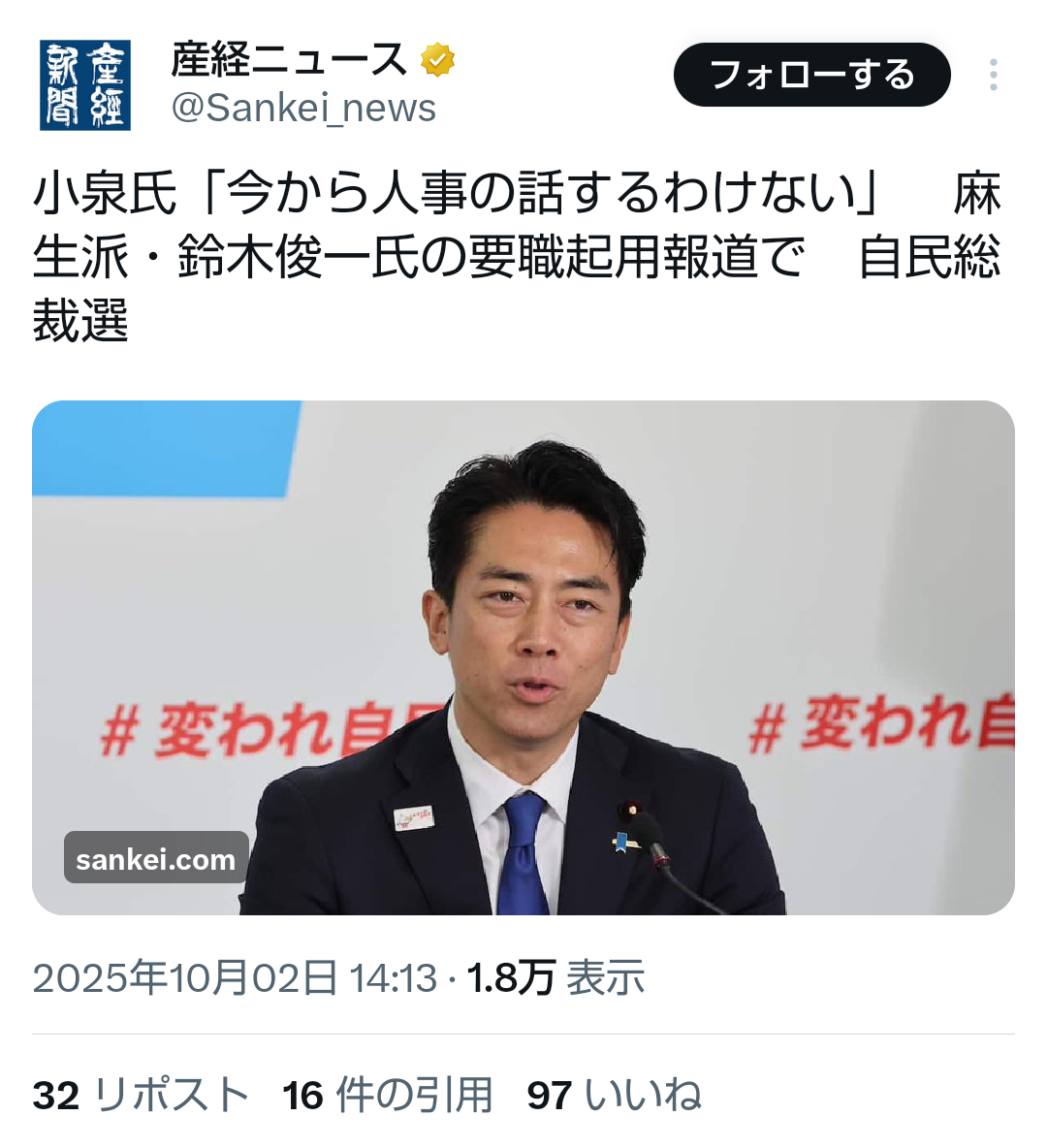 … | 538無題Name名無し 25/10/02(木)19:56:00No.748416そうだねx1 1759402560478.png-(390995 B) ![]() >小泉氏「今から人事の話するわけない」 麻生派・鈴木俊一氏の要職起用報道で 自民総裁選 |